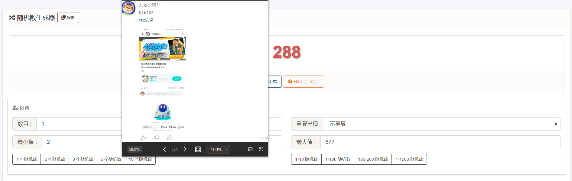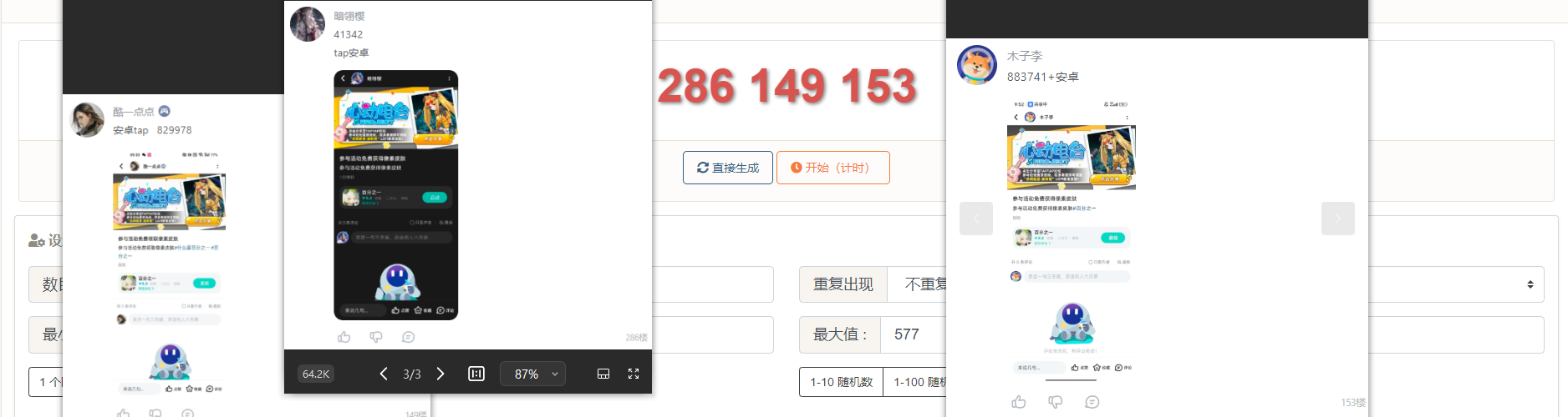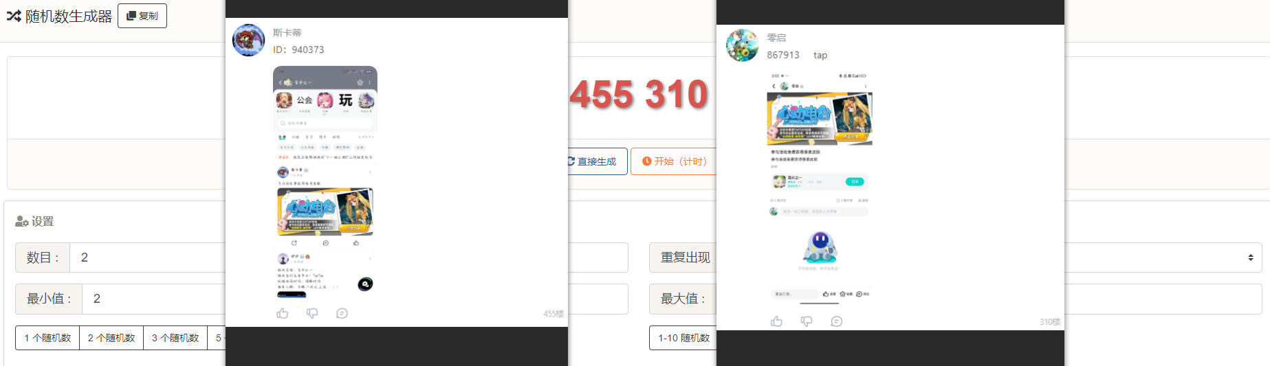 2:奖励以结束时间总楼层数为基准,由在线随机数生成器随机选出;