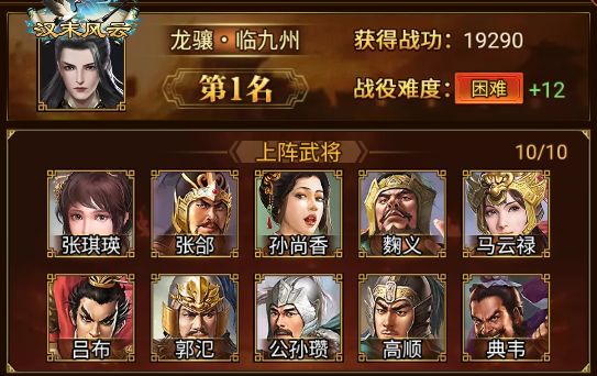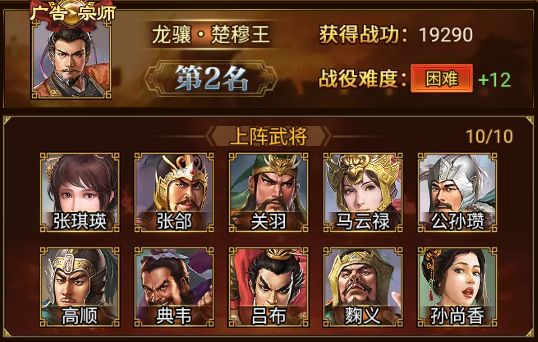 本期益州之战中赢得第二位的是 龙骧·楚穆王 军团,同样以 19290 的战功攻破 困难+12,强者锋芒尽显!