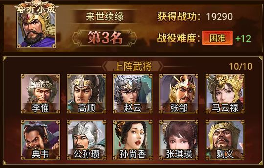 本期益州之战中赢得第三位的是 来世续缘 军团,以 19290 的战功攻破 困难+12,恭贺卓越成就!