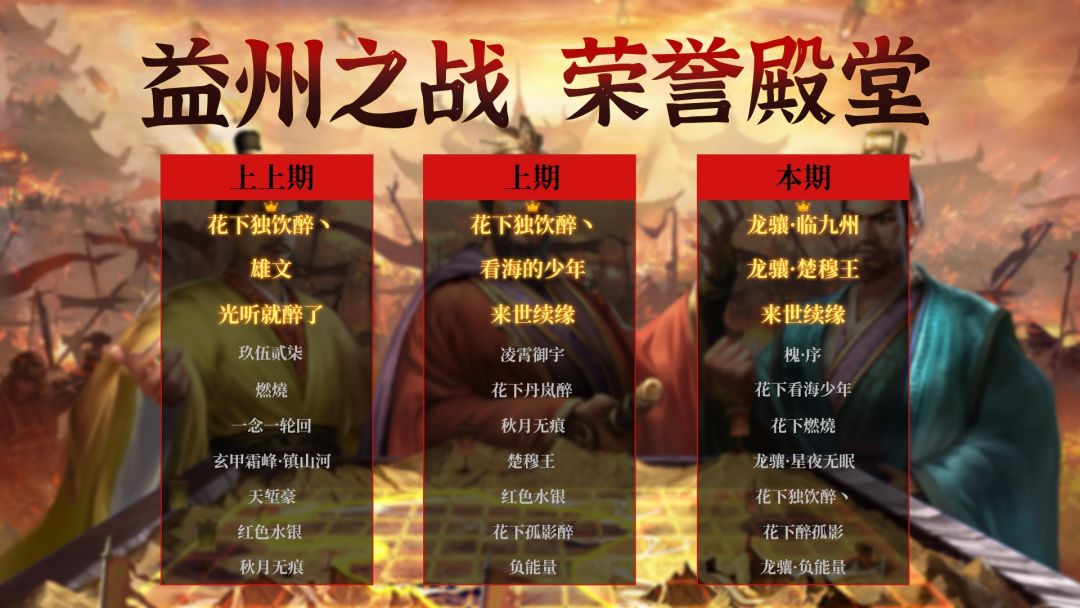 在本期益州之战中荣登TOP10的勇士们依次是:龙骧·临九州、龙骧·楚穆王、来世续缘
