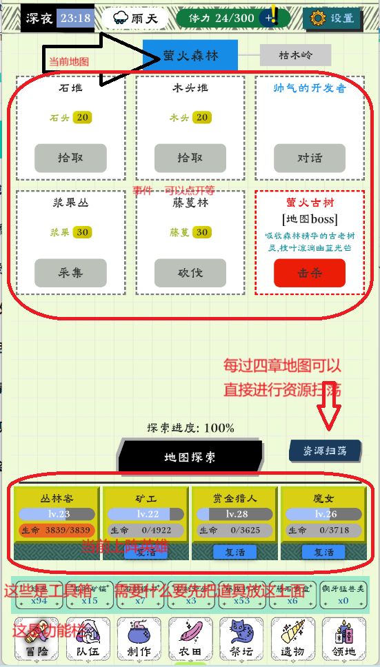 在过图期间打不过BOSS后,就主要拿材料做宝石。设置陷阱捉宠物。寻宝遗物。农田种菜(主要经验药)体力按优先顺序给。