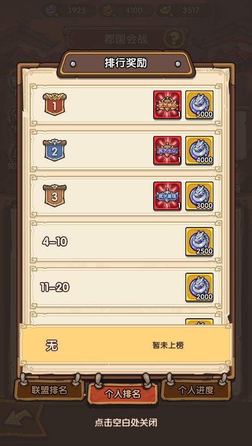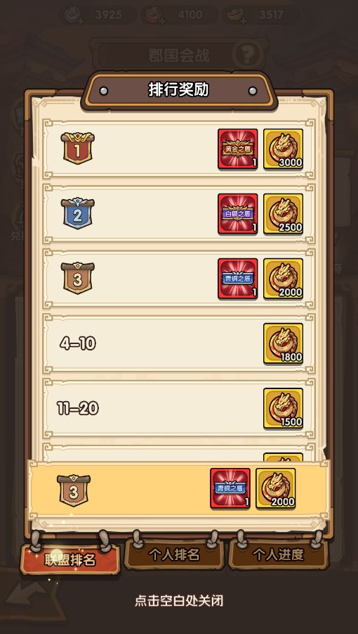 周五00:00~周六00:00--大国之战:该阶段完毕后联盟总伤害排名最终确定,并且将会向参与过任一阶段挑战的成员发放排名奖励;