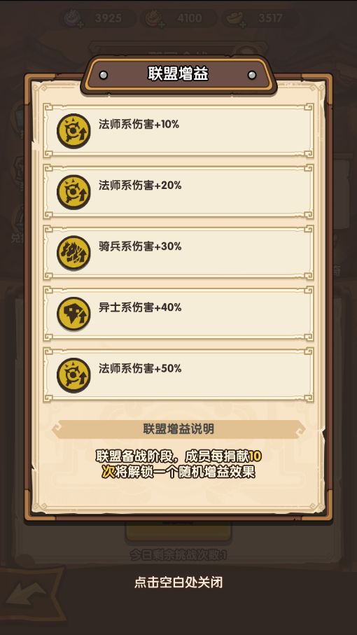 2. 周二00:00~周三00:00为备战阶段,根据当日成员总捐献次数可随机解锁一些增益效果,增益效果在后续多个挑战阶段中,对全联盟成员生效