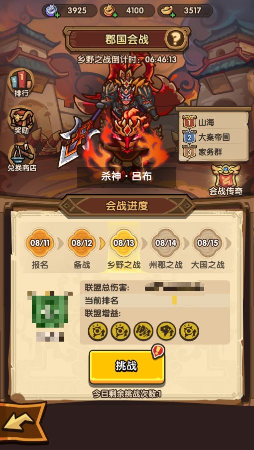 郡国会战是联盟轮换PVE玩法,玩法中主公们以联盟为单位报名参战,在三轮boss战中进行总伤害的比拼,挑战后决出本周的联盟排名,并根据排名发放每周奖励。玩法考察主公的整体战力和对不同boss的应对能力。