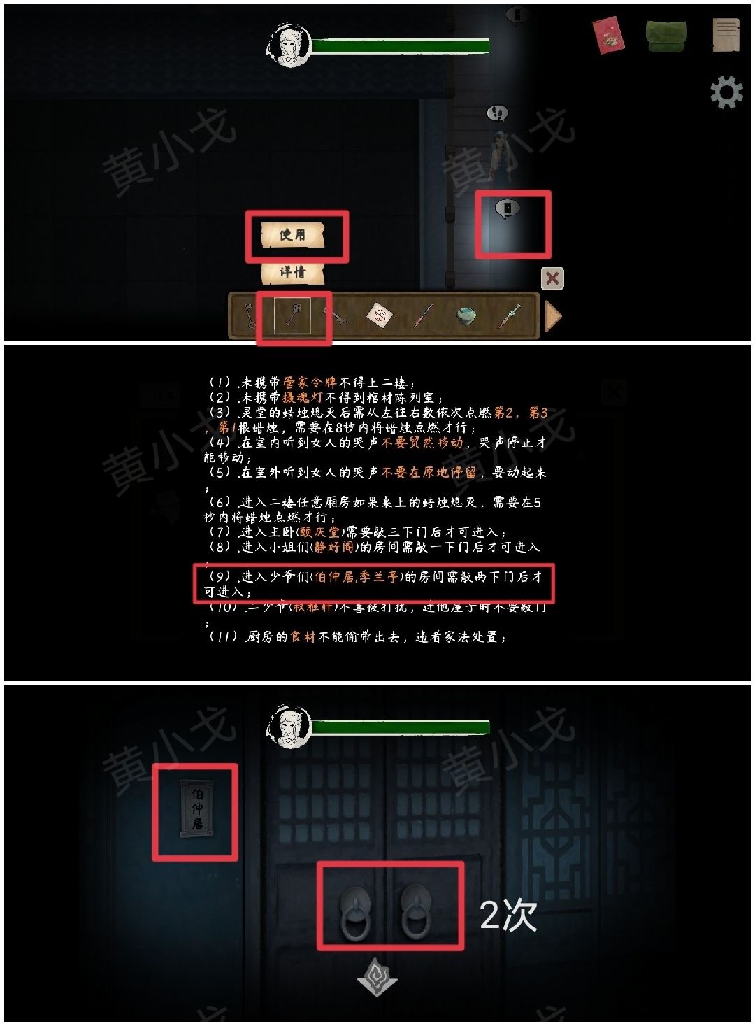 1.用【伯仲居钥匙】打开伯仲居厢房的门;根据【情报·段氏家规】上的线索,敲两下门