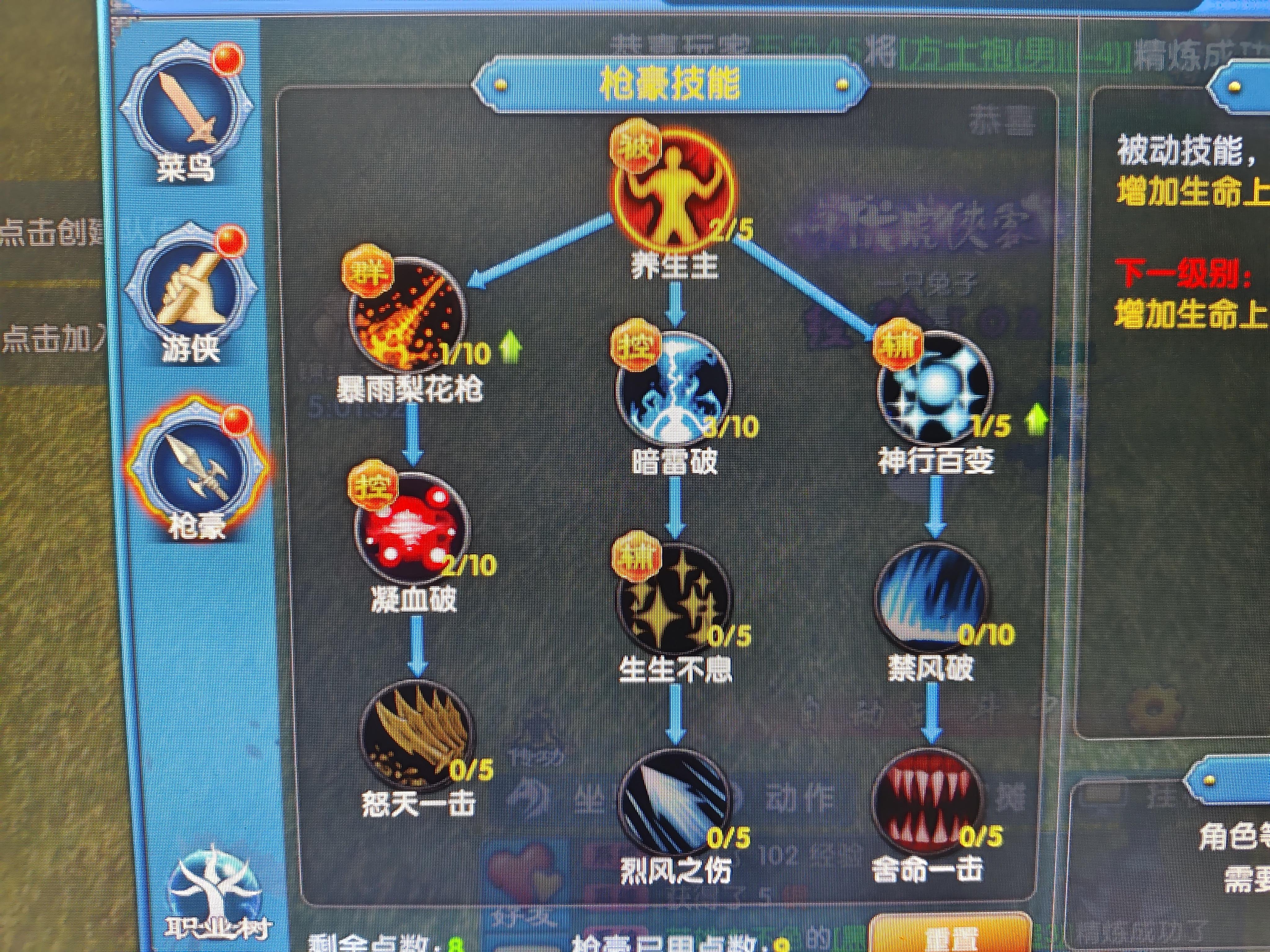 枪豪:主流玩法:被动养生主加满,凝血破、暗雷破、禁风破都暂时加到五点,舍命一击加满五点。拉怪玩法(娱乐):暴雨梨花枪适当加点(伤害提升不大),养生主、神行百变、生生不息加五点,其余加一点即可。