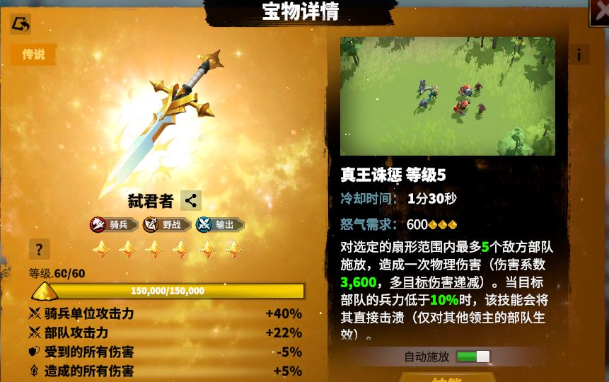 交战时所率部队每隔15秒获得10秒的攻击力提升效果。属性提升技能,攻击力提升效果对骑兵部队来说很不错。