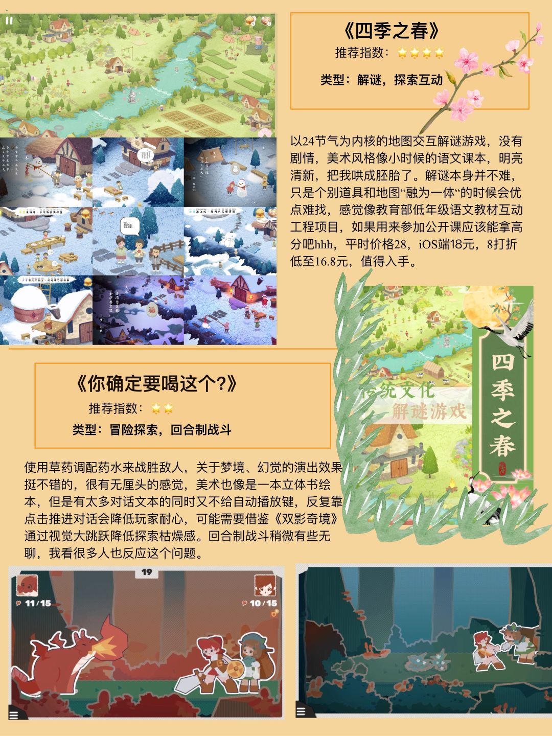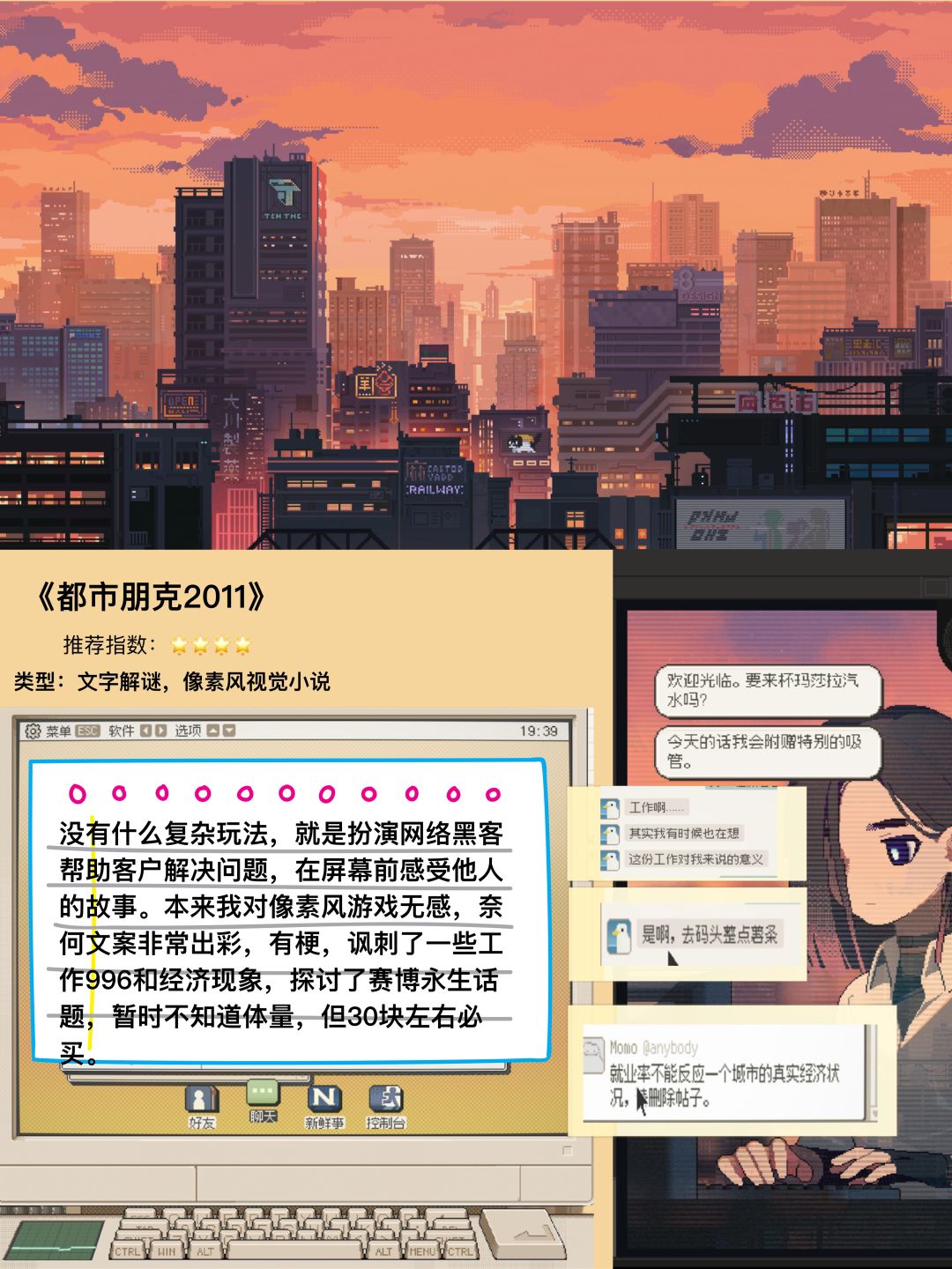🌟本人喜欢玩模拟经营、放置养成类游戏,前阵子深度体验了steam的新品游戏节,总的来说,我比较推荐《呓语小镇》、《猫神物语》、《四季之春》、《猫猫钓游记》、《赛博朋克2011》这几个游戏,他们的游戏设计比较成熟,没有明显短板,无论是美术、文案、经济系统都有其特别之处。