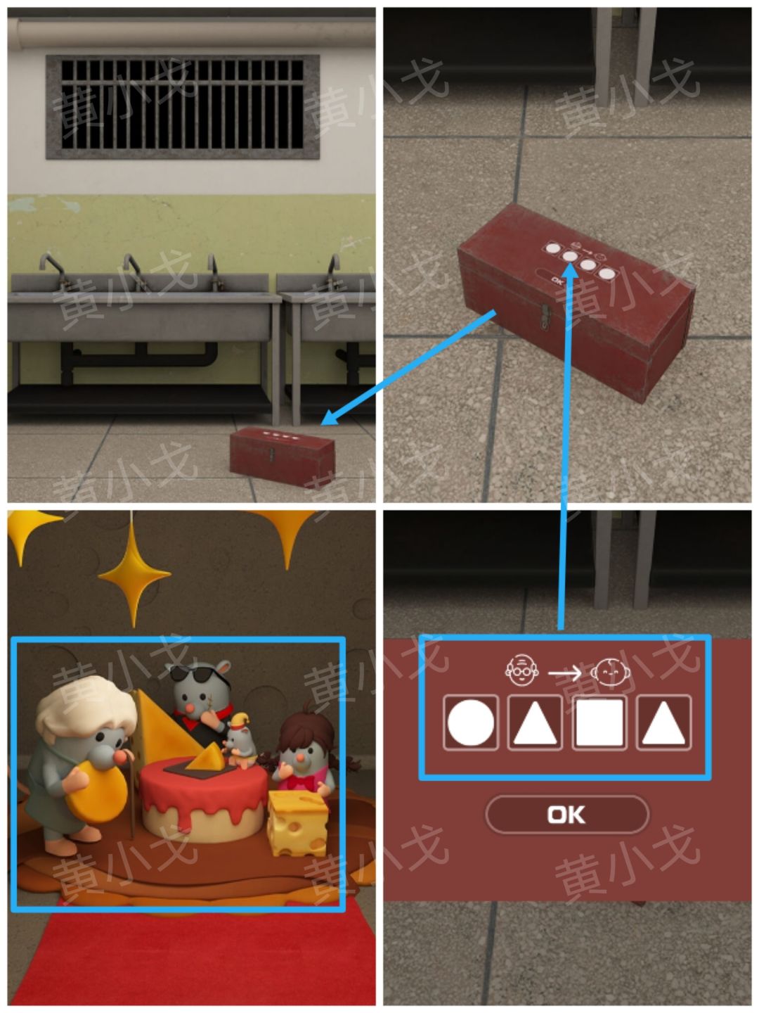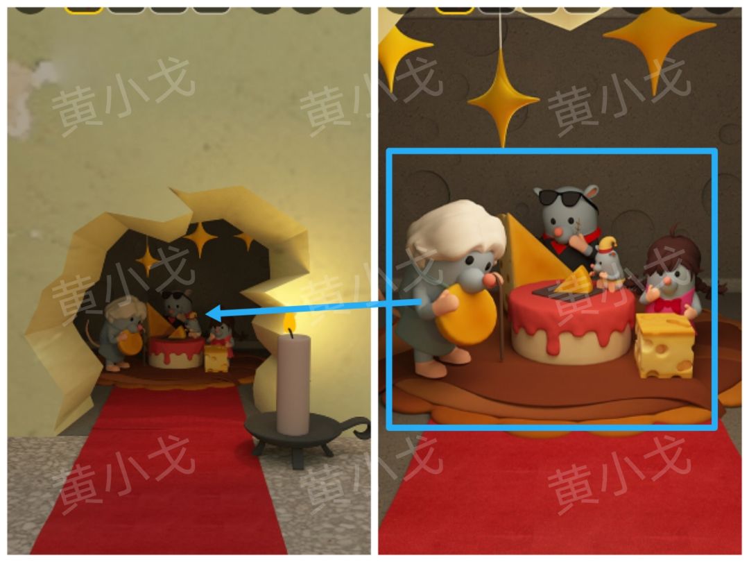 14.点击红色箱子上的密码锁,根据上面的图案提示,结合老鼠洞中老鼠的岁数及对应的奶酪形状线索,调整密码锁