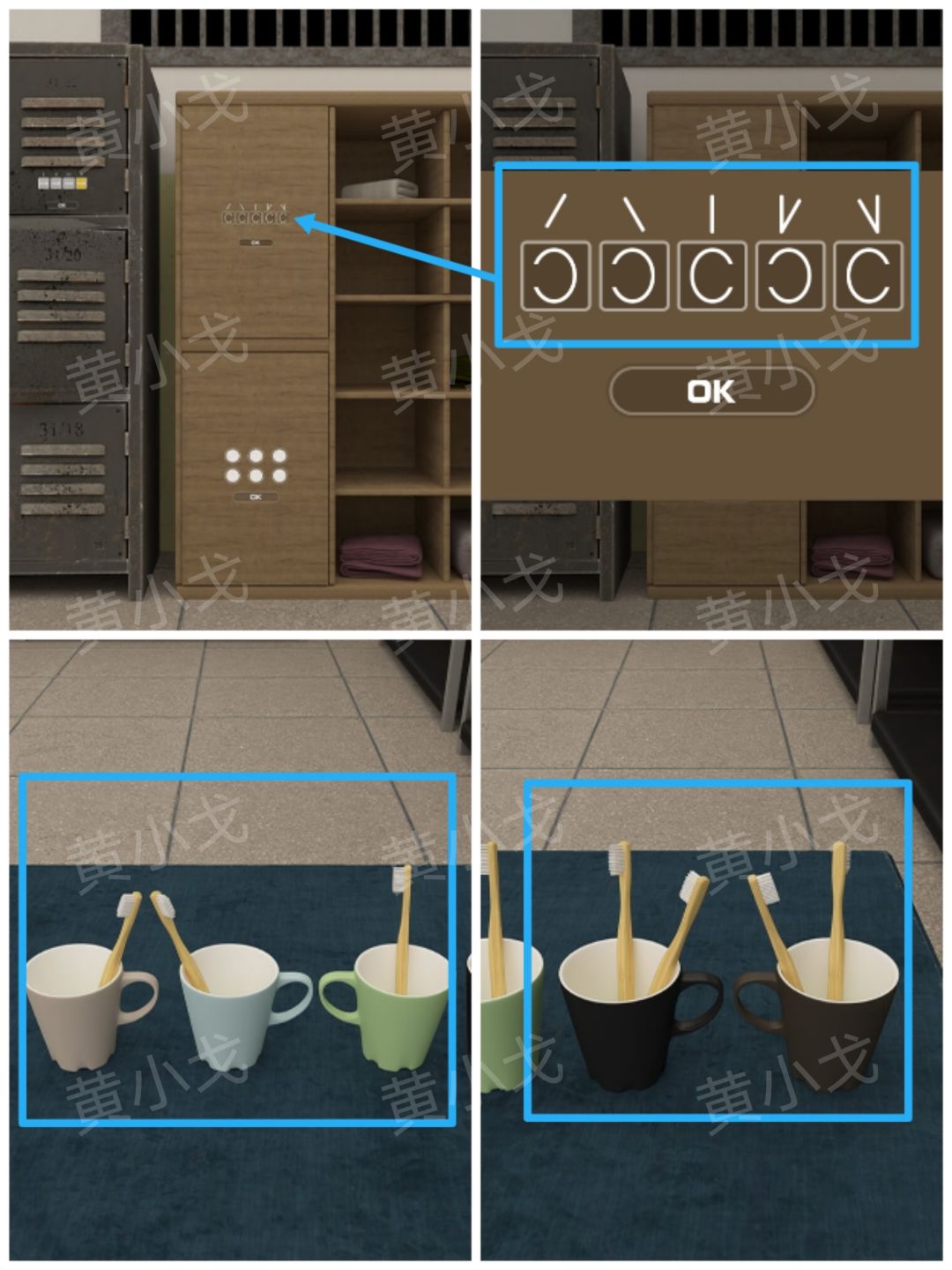 5.点击毛巾柜上层柜子上的密码锁,根据上面的提示,结合[洗漱室]场景漱口杯上的线索,调整密码锁
