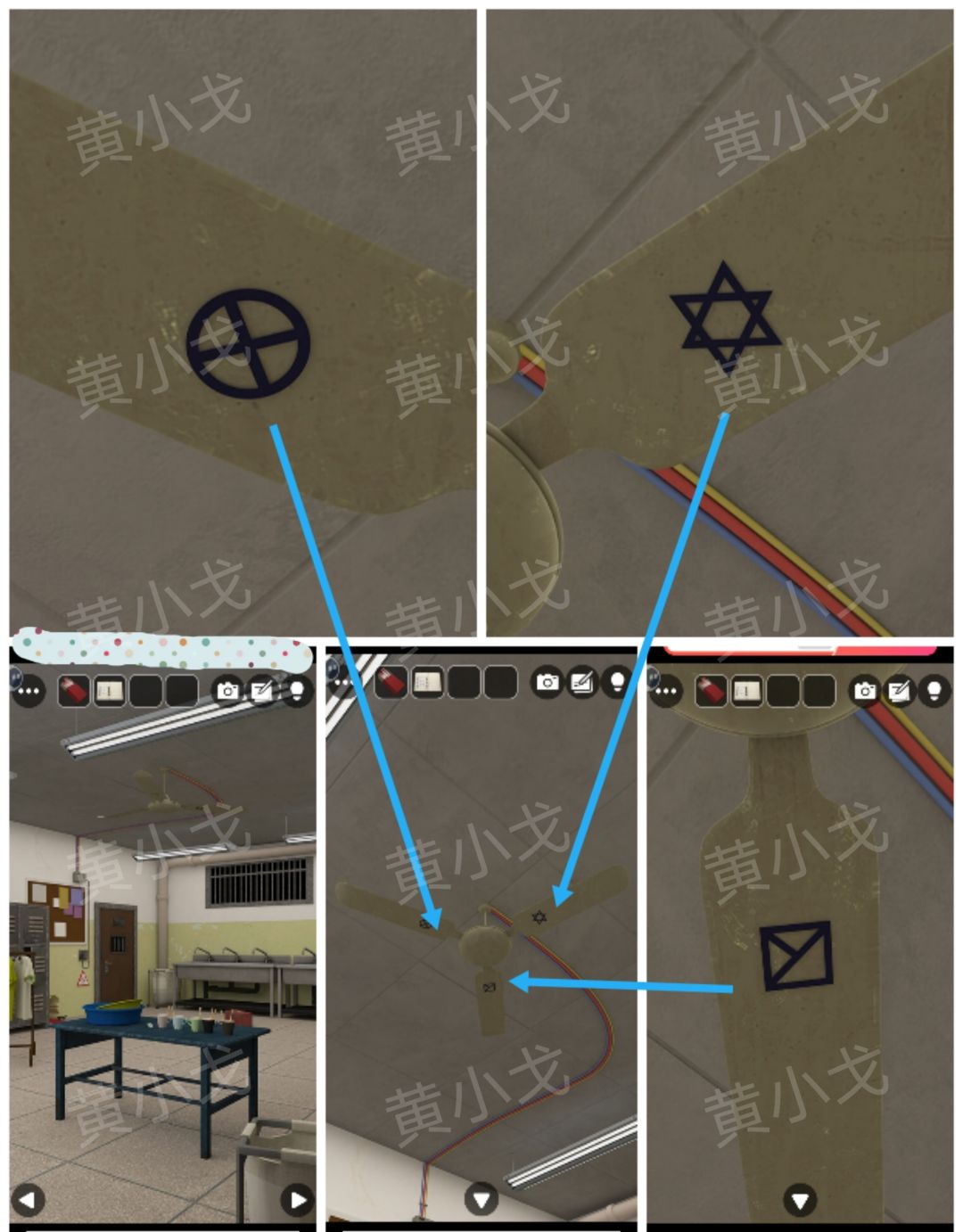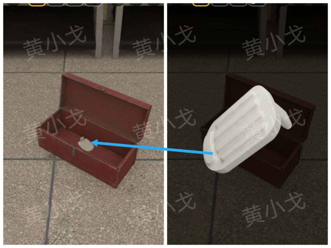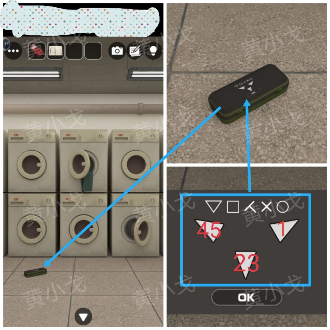 8.点击地上的文具盒,根据上面的图形提示,结合[洗漱室]场景扇叶上的线索,按顺序按下按钮