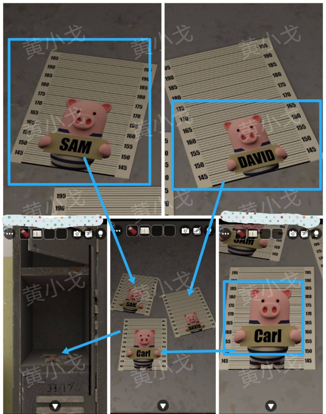 🔶[洗衣房]场景犯人照片上的线索(犯人的名字及身高):175-SAM、165-DAVID、185-Carl