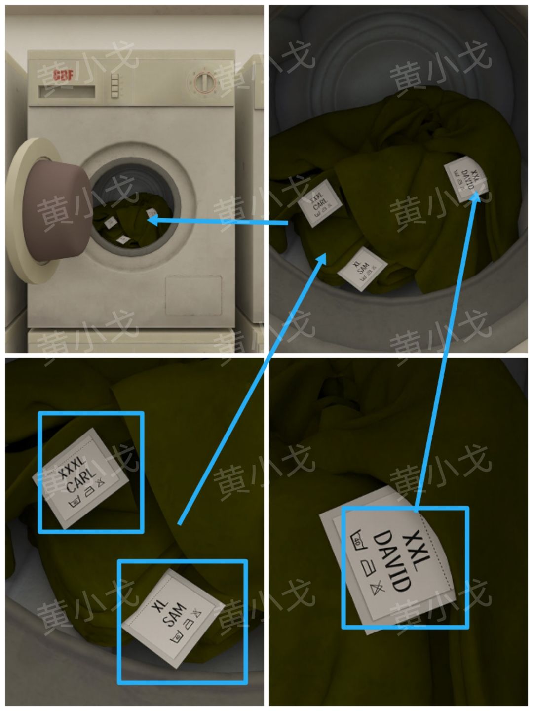 🔶[洗衣房]场景犯人衣服上的线索(犯人的名字及对应的码数):SAM-XL、CARL-XXXL、AVID-XXL