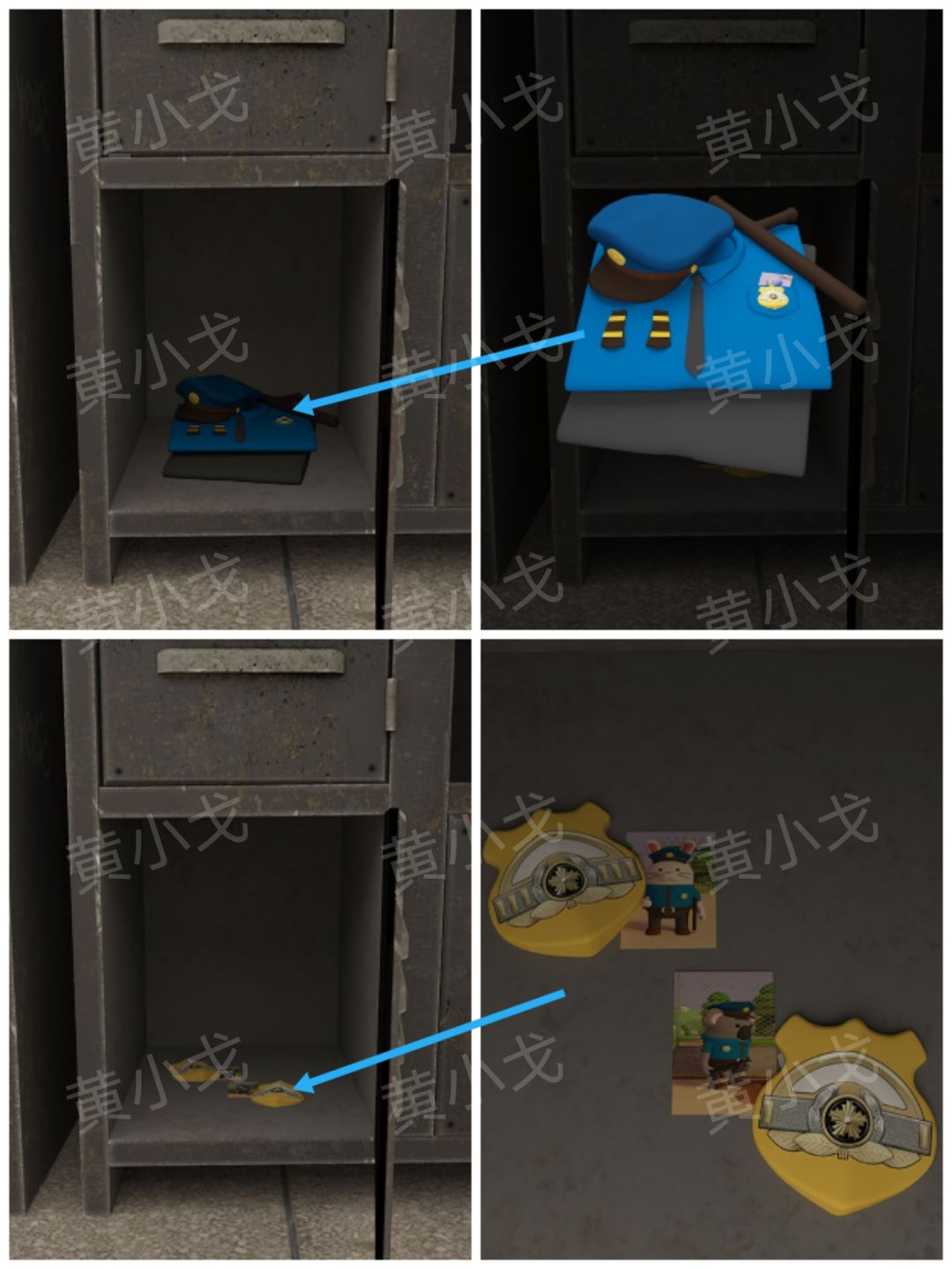 21.打开储物柜,获得【警服】;查看柜子里的照片,注意警员手部朝向和警徽上的横杠数量