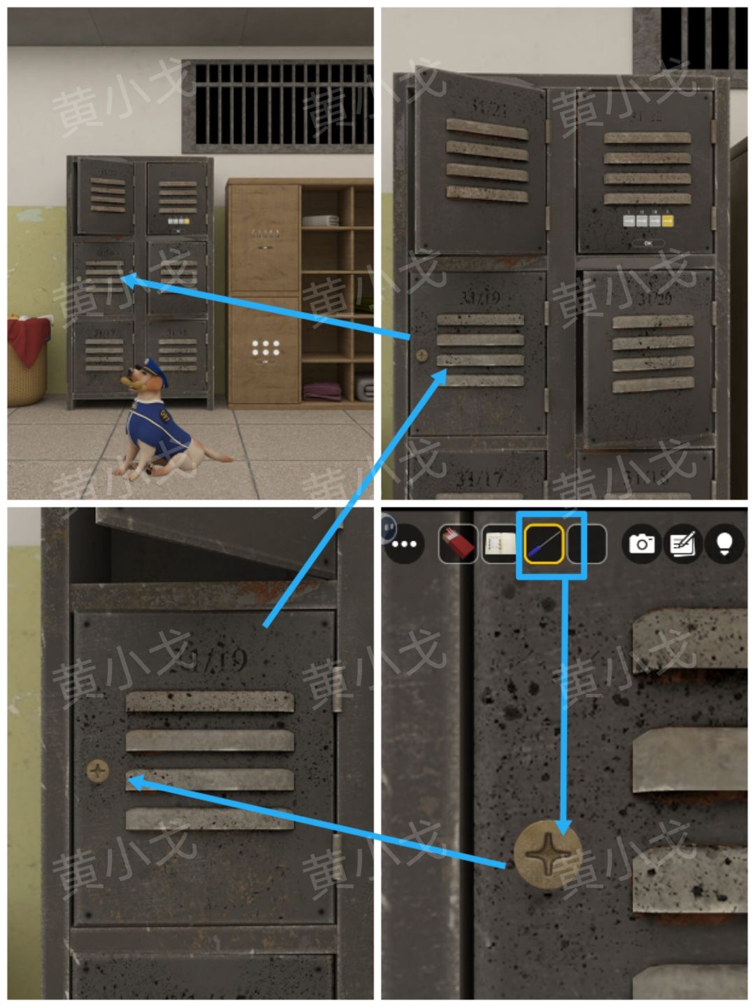 26.点击储物柜上层右侧柜门上的密码锁,根据上面的横杆数量提示,结合[洗漱室]储物柜里的照片上的线索和[走廊]两位警官身上的警徽线索,调整密码锁