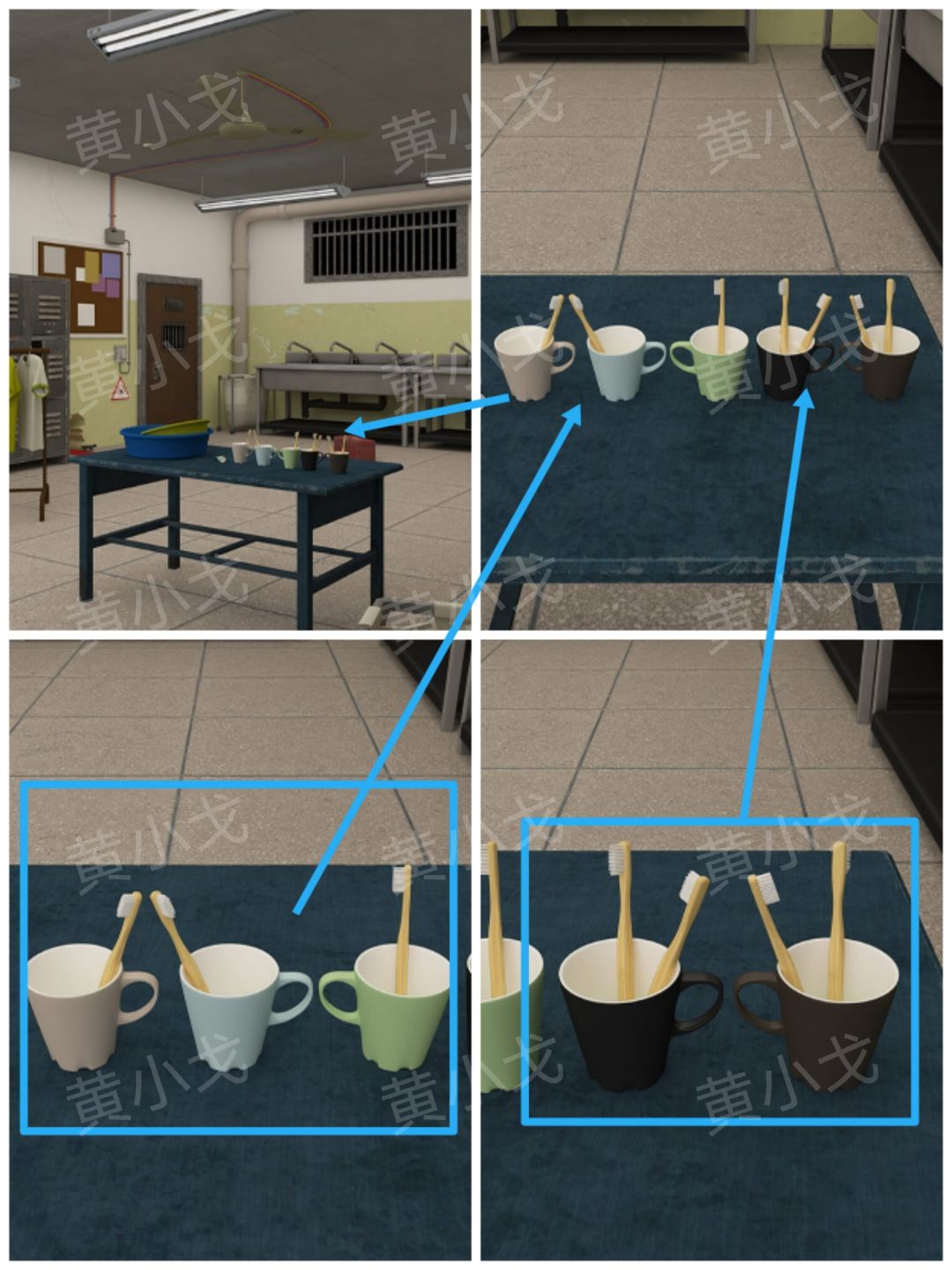 1.点击桌子,查看漱口杯中牙刷的数量、摆放形状和杯子把手的朝向