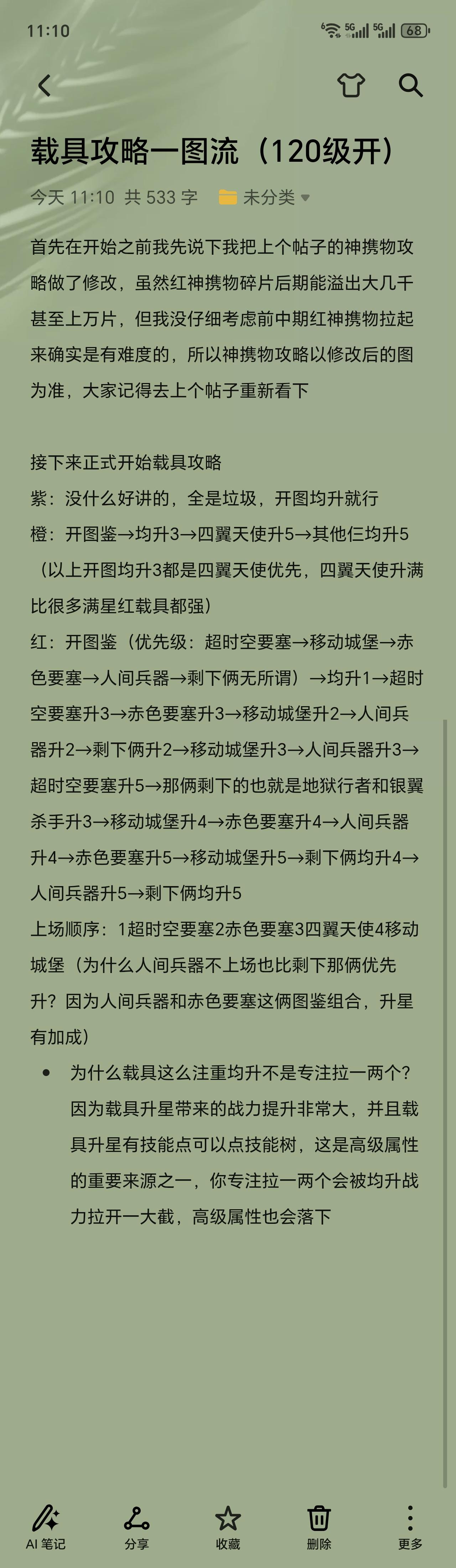 神携物:橙和红优先开图中两个。蜡烛必须先升3,然后3星假面,3星蜡烛+高配忍者,基本上开局一个大就死一片,假面给副c。其余角色的神携物根据自己需求弄(免伤给前排,加治疗给奶妈)。载具可以按第五张图来(借鉴某位玩家的图,如侵权请联系删除)