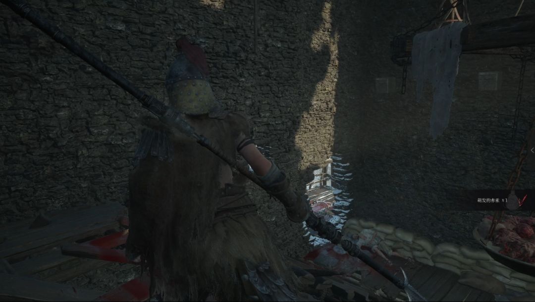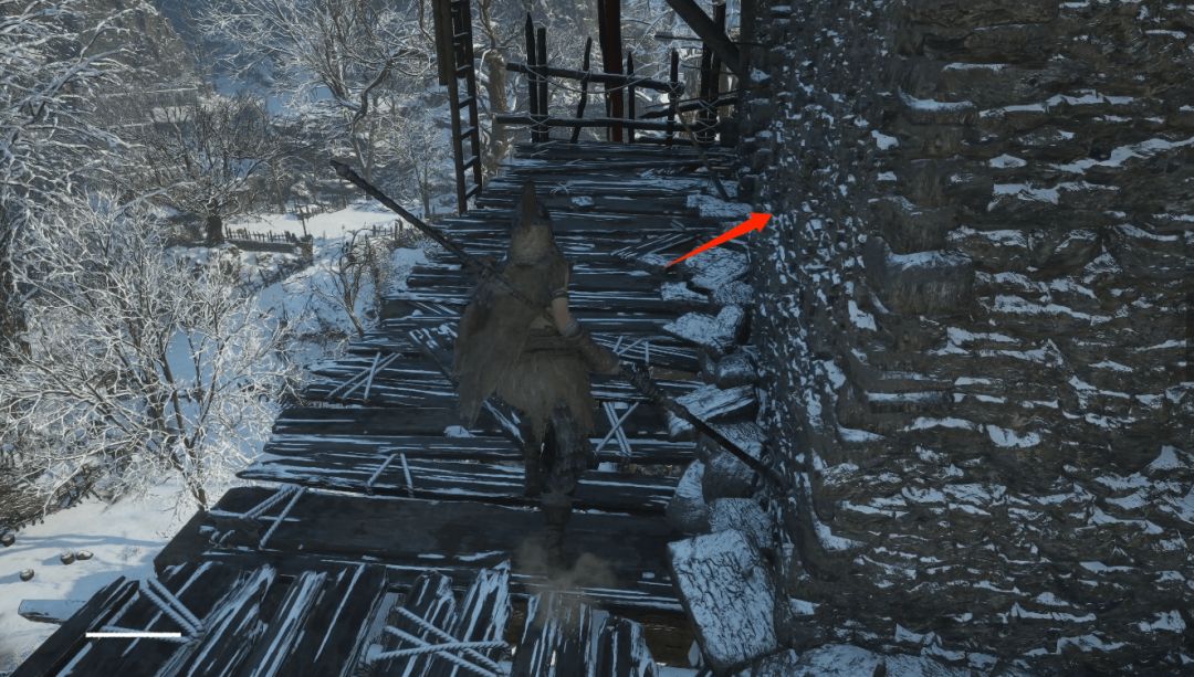 沿着木梯向上爬,右侧墙壁裂缝处进入塔内,注意门口有阴人小怪,屋内拾取【萌发的赤汞*1】【击破飞刀*5】,走木坡道向上鼓边拾取【萌发的赤汞*1】。