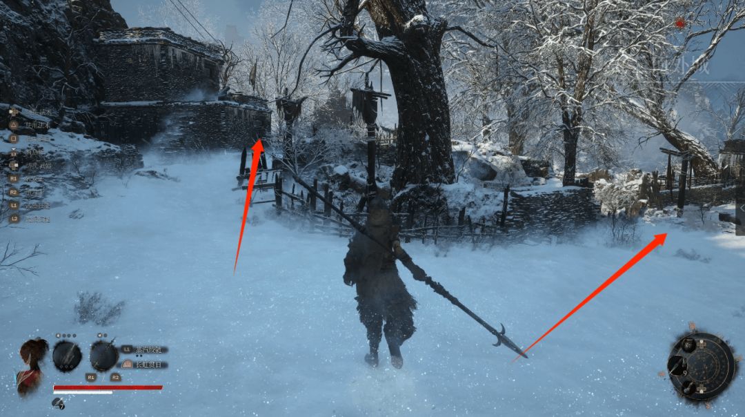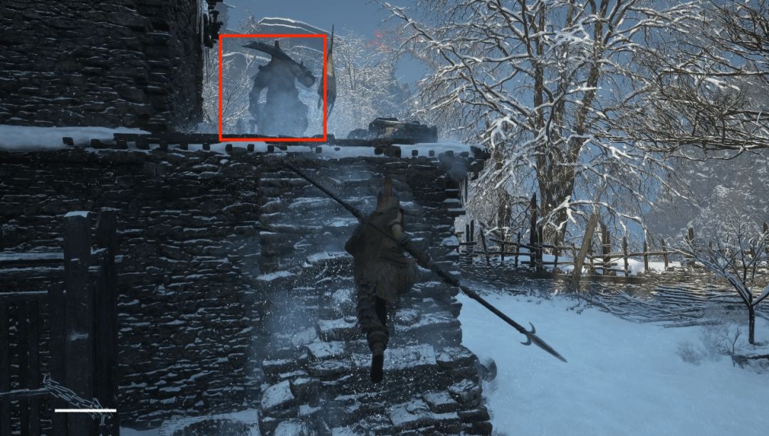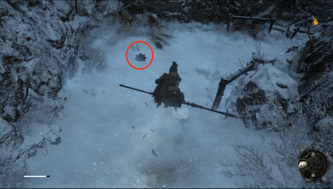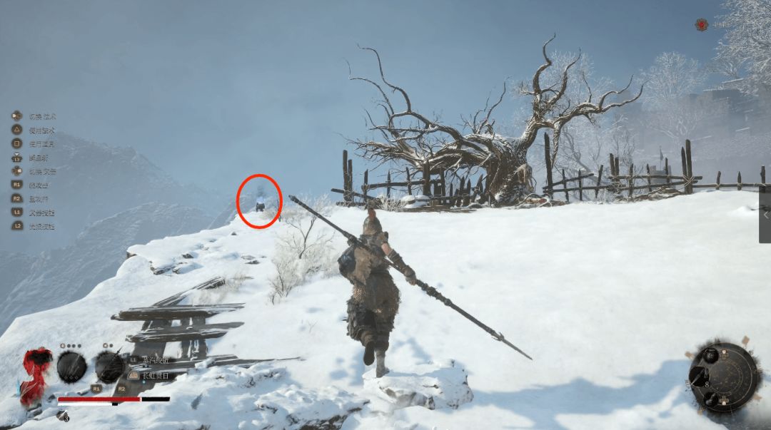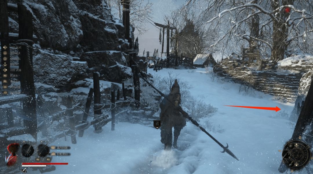 下坡底部左侧圆圈处会发现年岁长在这里,我们和他交谈即可解锁BOSS战使用骨哨召唤年岁长助战。前方木门就是BOSS艾能奇。