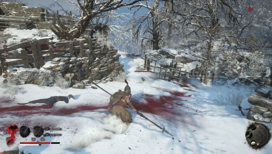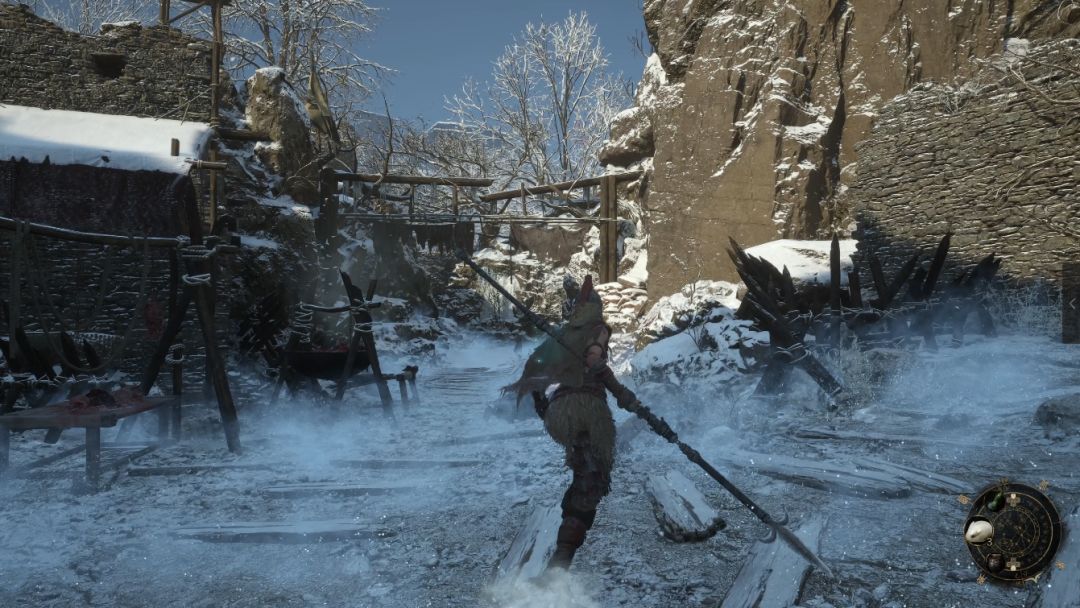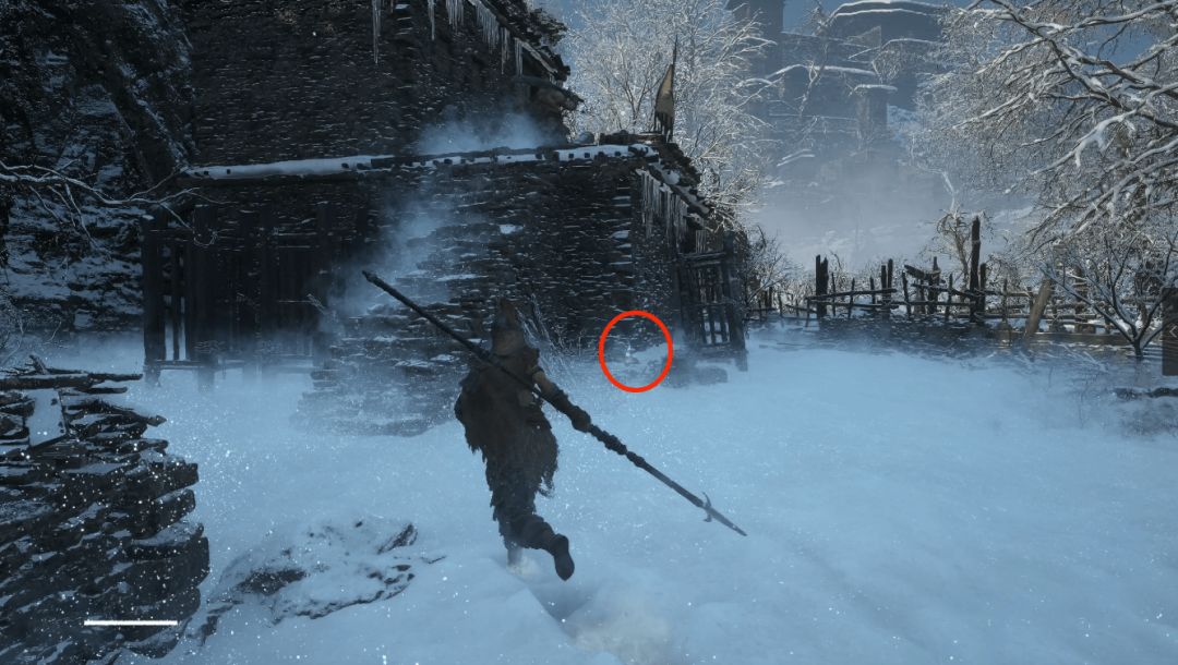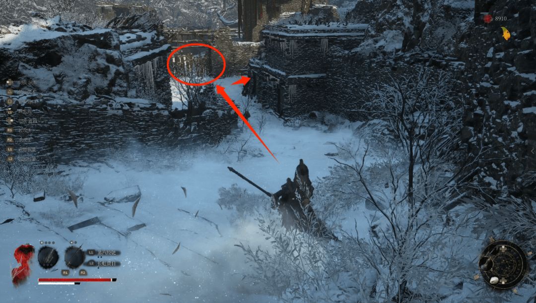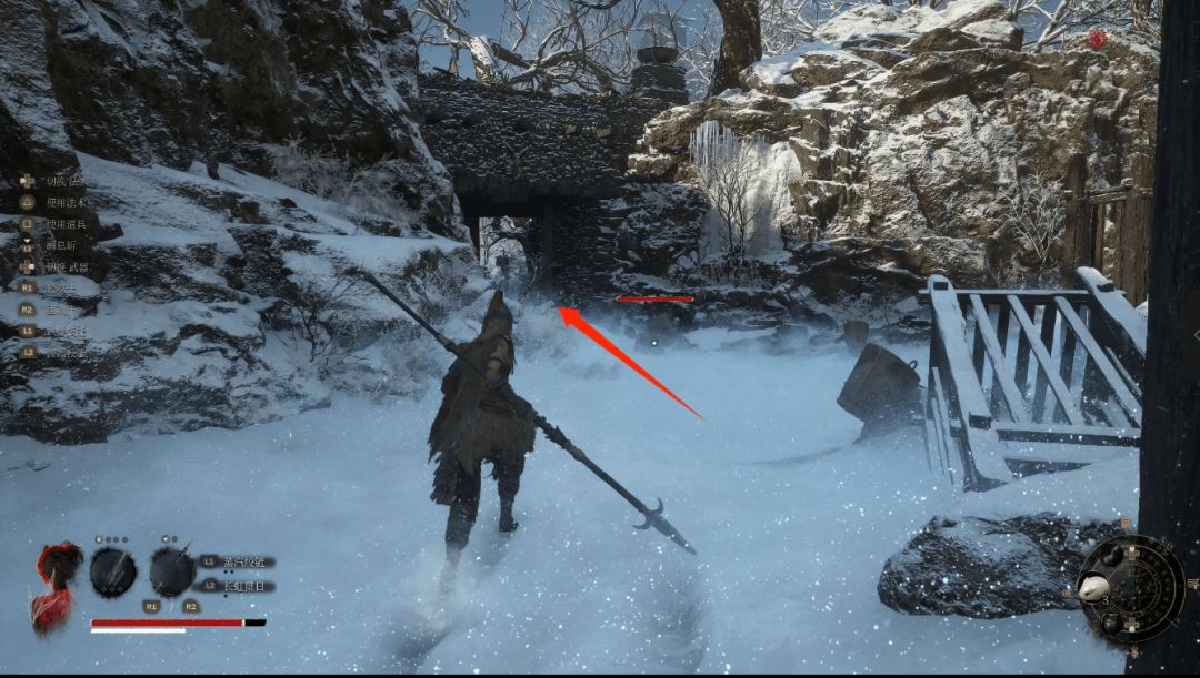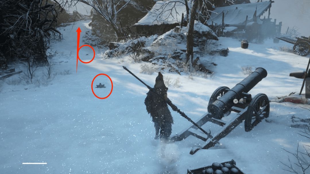 下坡底部左侧圆圈处会发现年岁长在这里,我们和他交谈即可解锁BOSS战使用骨哨召唤年岁长助战。前方木门就是BOSS艾能奇。