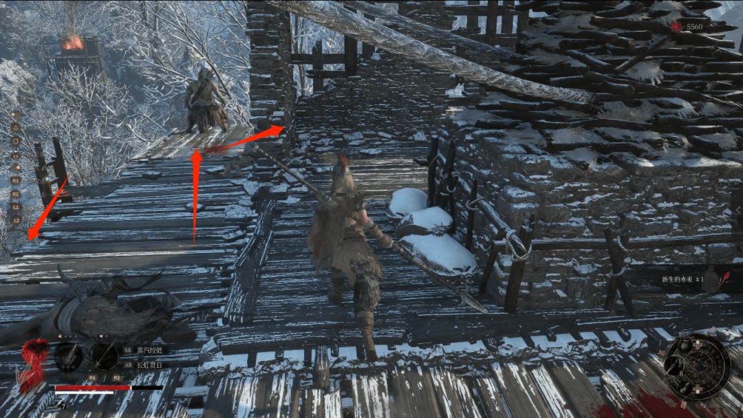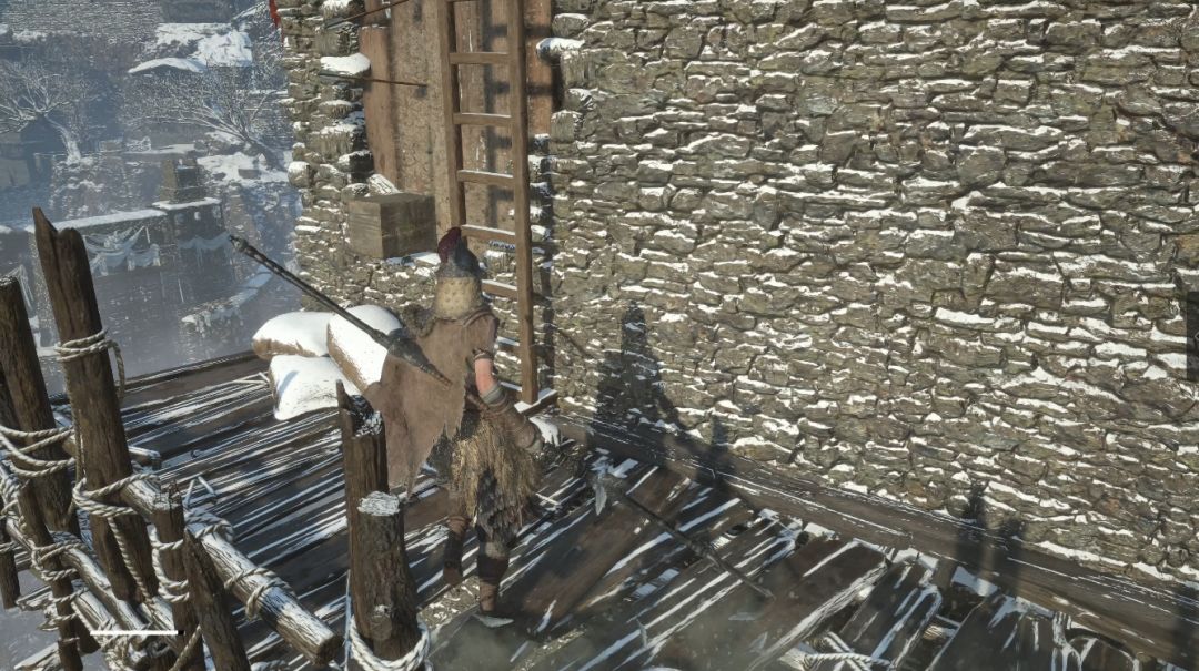 击败平台上弓箭手后往后看后方还有一名弓箭手,不要直接过去背刺他,右侧墙角藏有小怪,注意闪躲不要被推下去。旁边梯子踢下去解锁捷径。顶部平台宝箱开启获得先神之言【未·背击·强攻】。