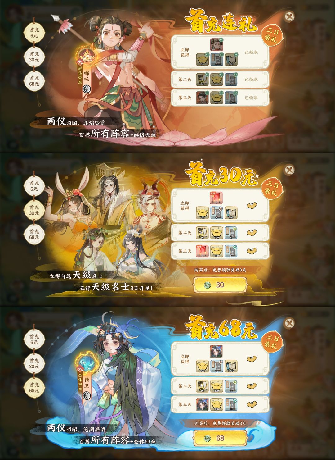 T0:首充(6元+30元+68元)