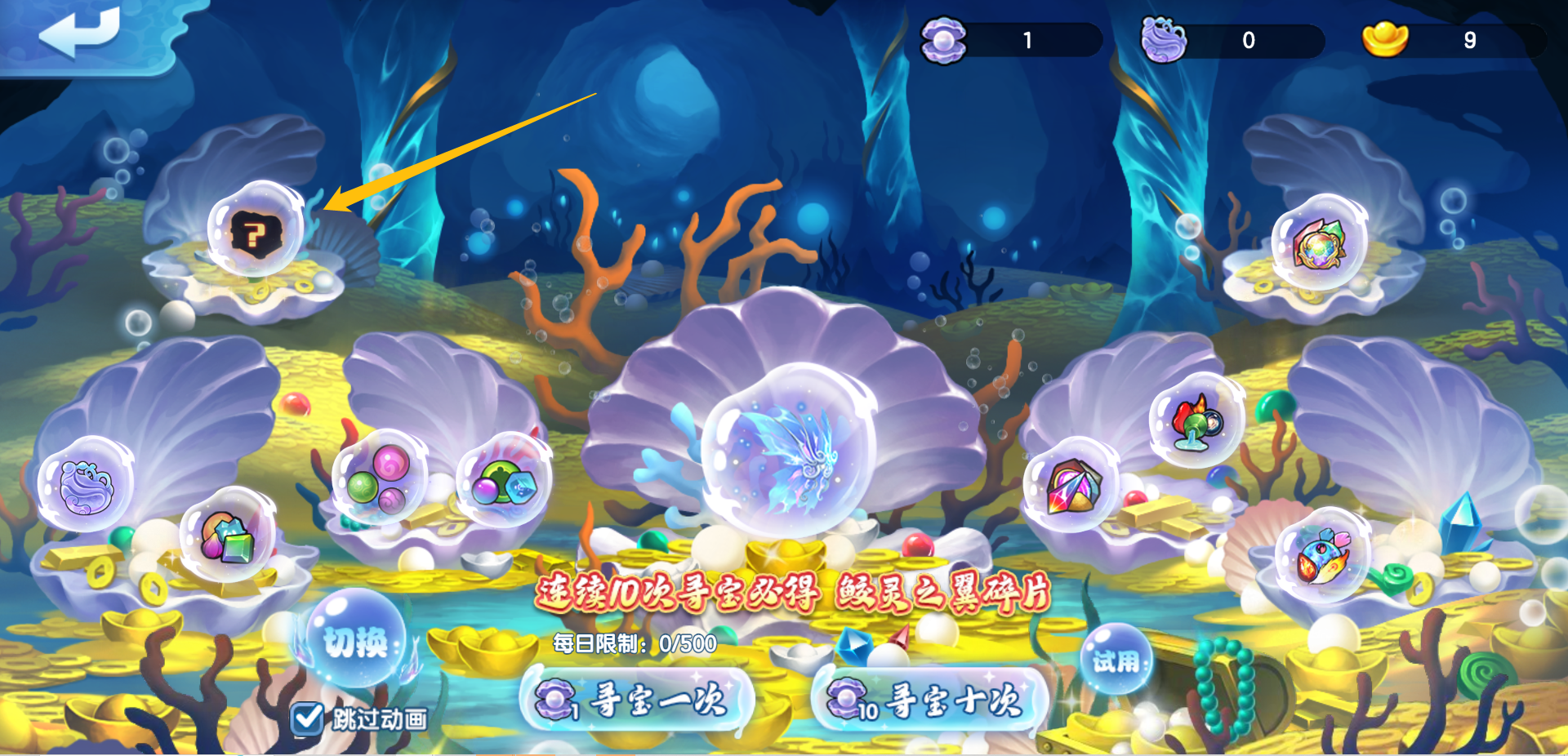 每次寻宝需要消耗1枚【东海宝珠】,在寻宝期间将有机会获得所选大奖碎片(连续10次必定获得)、【珊瑚宝玉】或其他道具奖励。点击寻宝页中的奖励球可以查看奖励预览~