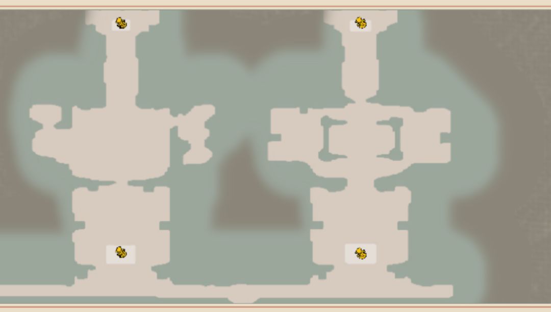 接着我们回到大殿,接着往右边走,地图如下,我们在左下角。