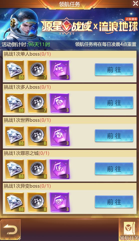 完成挑战任务,可领取钻石和强化道具,还能领取【领航星币】,用于补给兑换