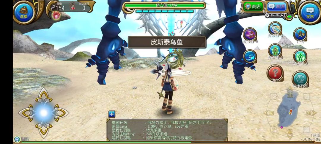皮斯泰乌鱼,简称皮鱼,还算好打(?)。茵(yīn)洁族这NPC不是很靠谱,动动手指放放魔法枪。超大范围风刀可以躲在鱼的背后,如果来不及就离远点找安全位置,这风刃虽然范围大但是慢。还有就是天火要小心,似乎是追踪脚底丢两次的