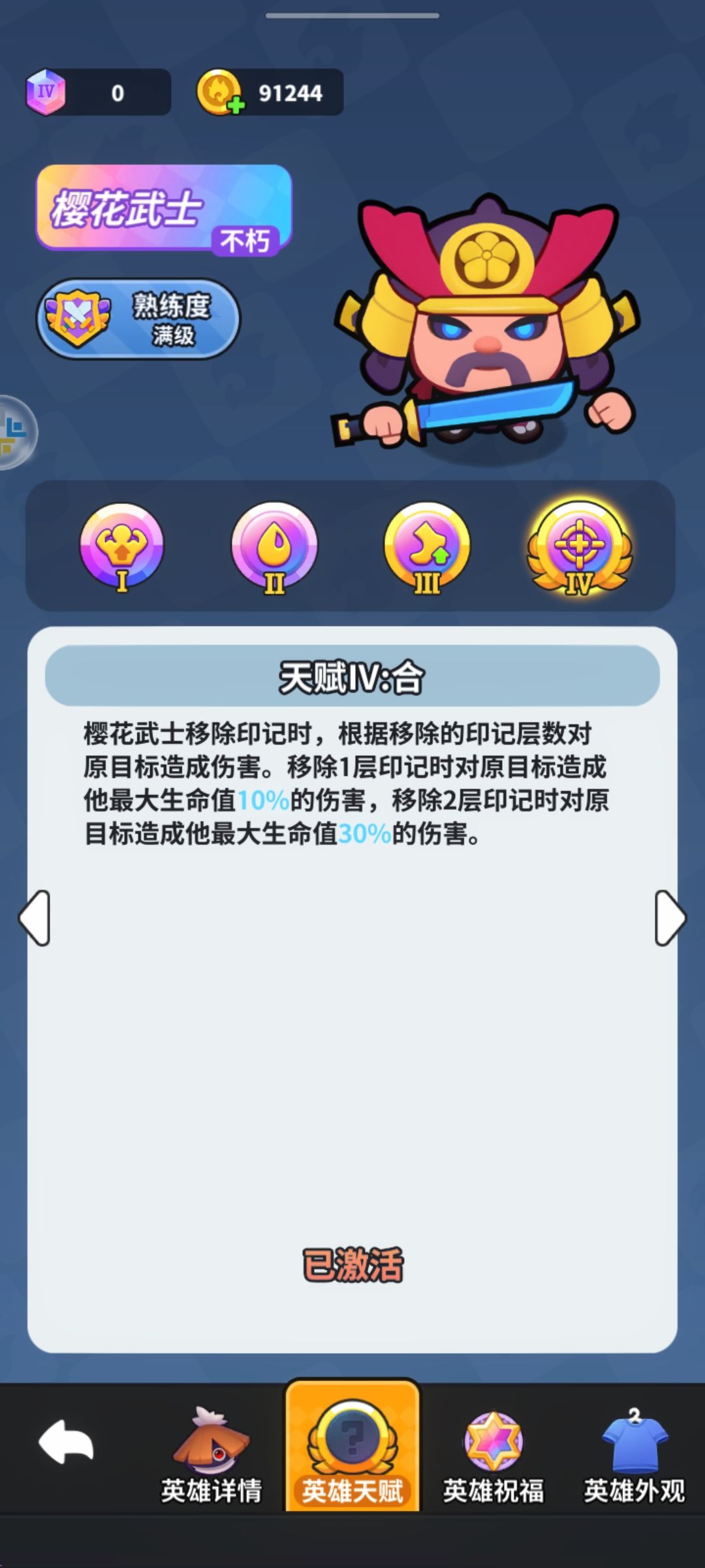 - 天赋等级:樱花武士2~4级天赋(核心,保证印记伤害和回血效果最大化);