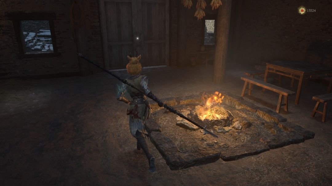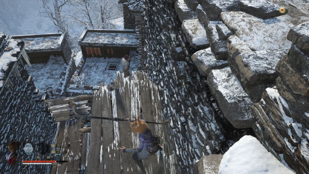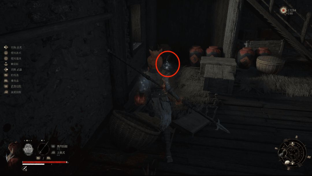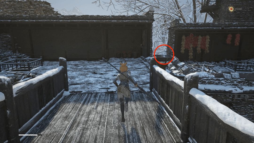 沿着楼梯攀爬到顶部击败敌人后边缘处拾取【胡辣汤*2】,从边缘处往下看小心跳到木平台上。前方敌人我们直接下落背后攻击破刹将其击杀。