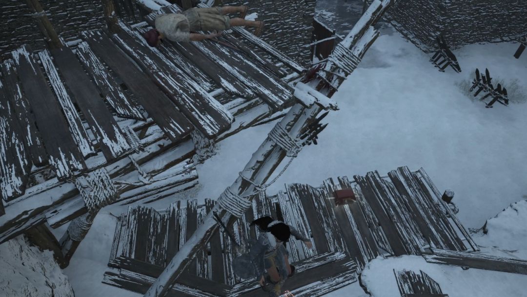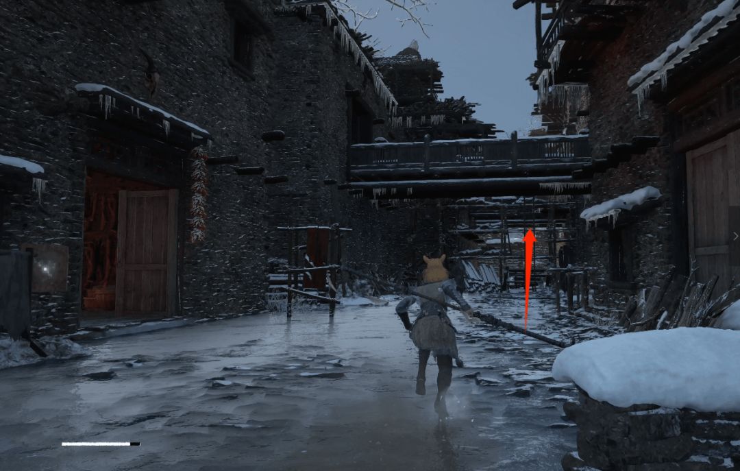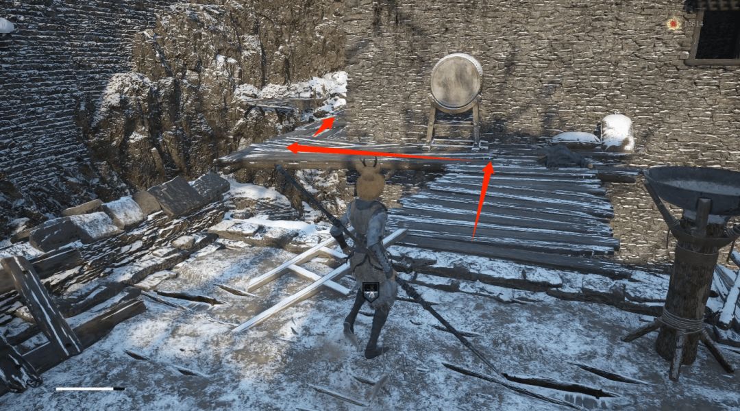 这里我们先踢开右侧箭头处木楼梯捷径,随后走左侧箭头上楼梯。