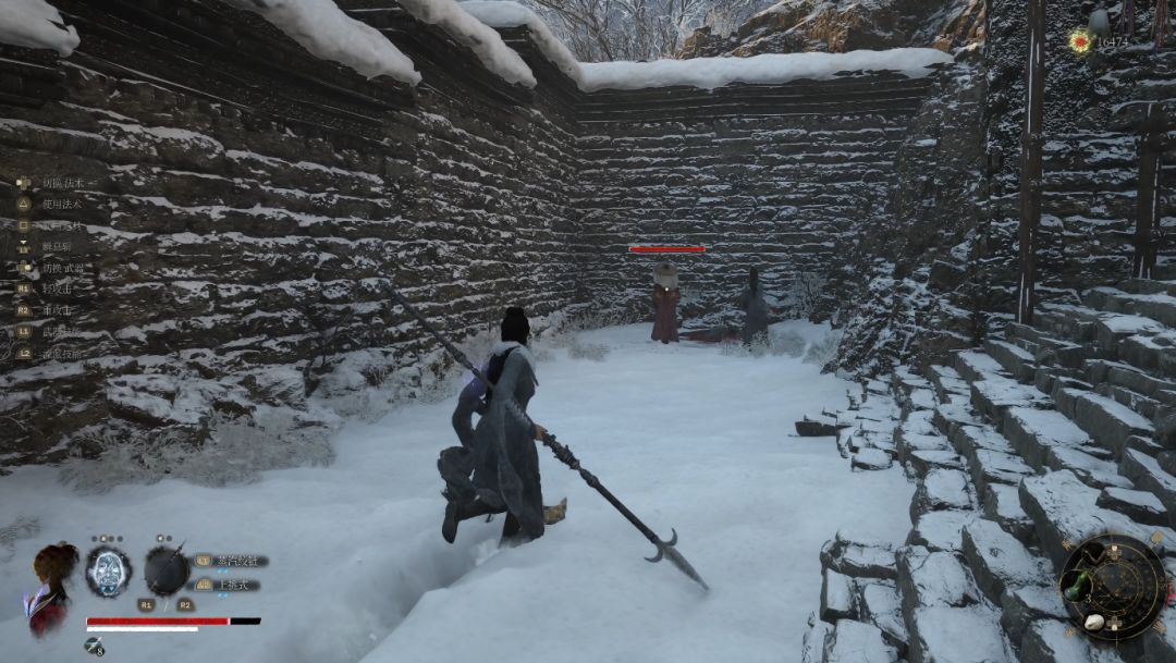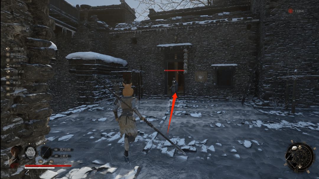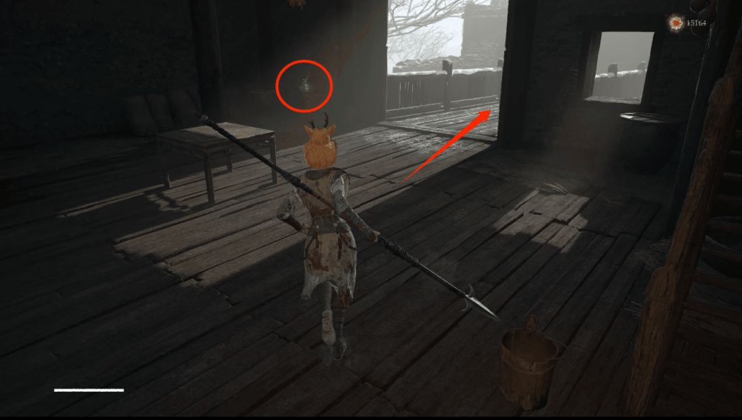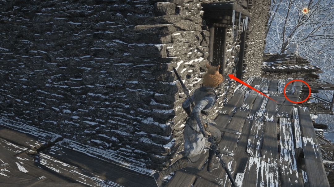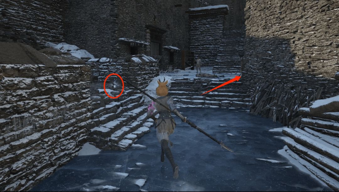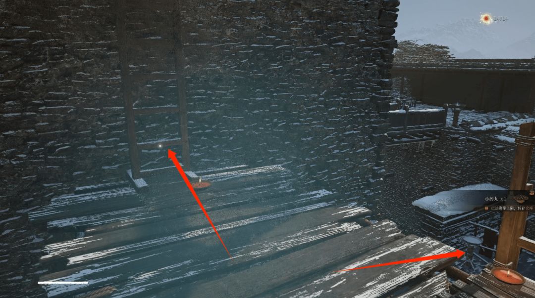 楼梯最底部击败强敌屋内拾取【小药丸*1】,桌上【火油弹*2】,宝箱内拾取【羽族追忆】。都拾取完毕前方木门捷径推开以后就可以直接从这边快速前往雪堡主堡。