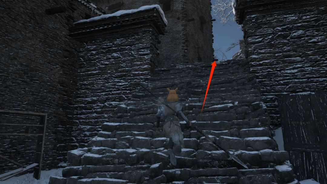 右侧就是雪堡主堡神龛啦,我们拜命一下神龛后不急着入梦,直接入梦会导致敌人刷新,走左侧箭头前进,下方末端就是云顶内城顶层尽头,