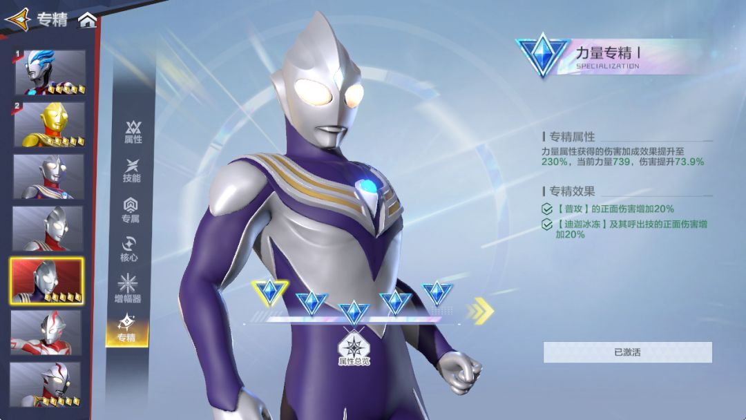 终极赛罗和闪耀迪迦都拥有3个专精属性,以闪耀迪迦为列:闪耀迪迦拥有的专精属性是力量专精,击破速率专精,破韧伤害专精。那么在激活专精点时低级专精提供的专精属性依旧是力量属性加成。