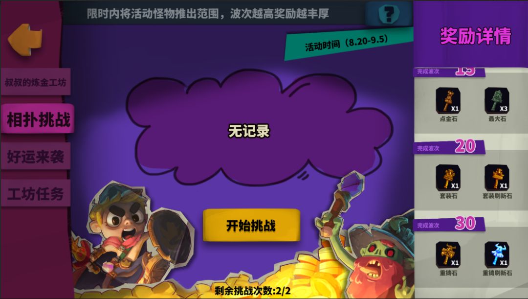- 骑士大人可通过每日活动任务获得一定数量的炼金锤,并使用炼金锤砸碎图中的绿色材料罐,可获得随机奖励。除了普通的炼金锤之外,骑士大人还可以通过购买礼包获得特殊的秘银锤,1个秘银锤可以直接砸碎3x3格子内的9个材料罐!