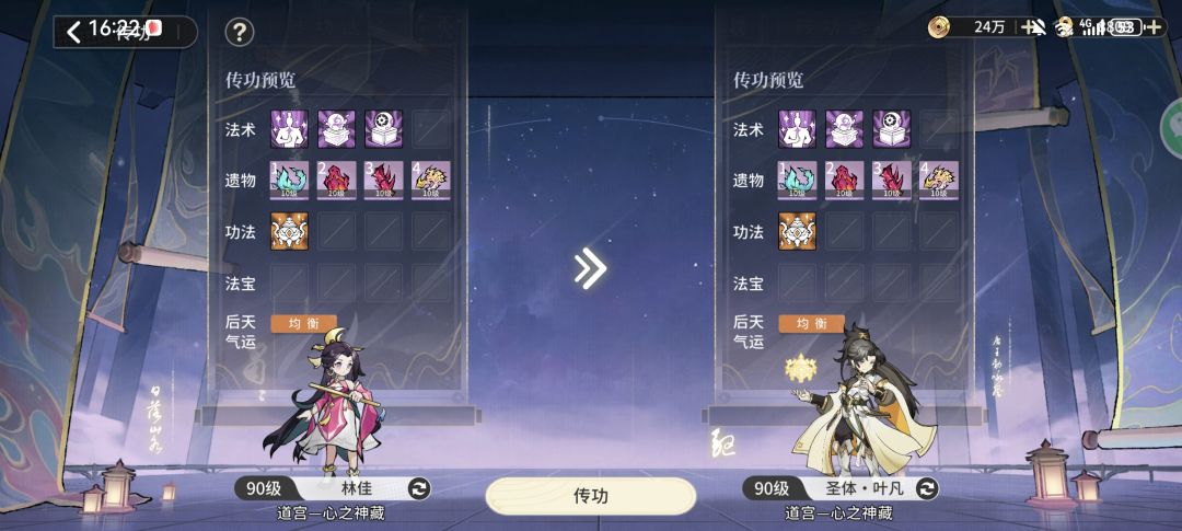 再把改词条所属角色与叶凡进行传功,我们会发现词条已经转移成功,接下来就是把阵容角色调回去,因为传功后技能之类的也被转移,这时候我们就可以使用先前保存的阵容将技能之类的复原。