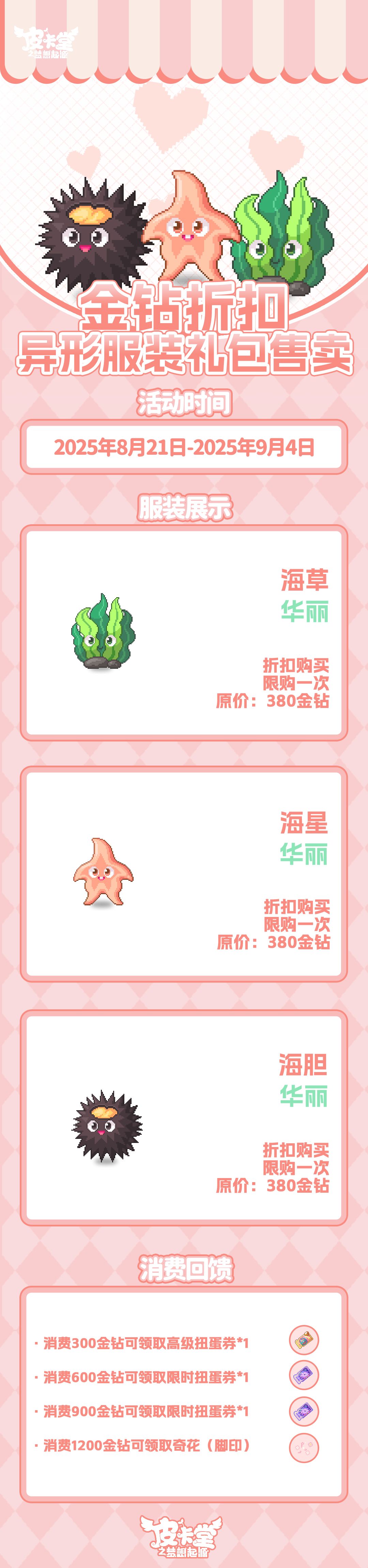 -【折扣异装】全新异装来袭!商城参与幸运折扣活动,可以优惠价格购入「海草」、「海胆」、「海星」异装! 商城内累计消费1200金钻可领取「奇花」脚印!