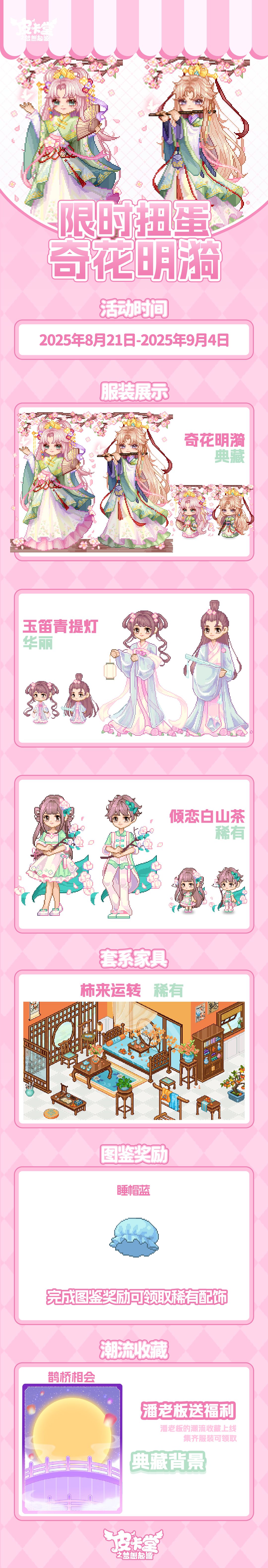 -【限时金币扭蛋】更新!参与可获得典藏套装「奇花明漪」、华丽套装「玉笛青提灯」、稀有套装「倾恋白山茶」,套系家具「柿来运转」!收集服装可获得名片背景「鹊桥相会」!完成图鉴收集任务可获得配饰「睡帽蓝」!