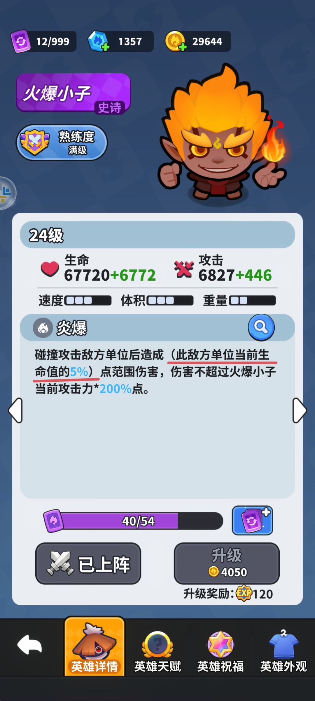火爆小子强就强在AOE伤害爆炸,这和他的技能机制有关。碰撞造成敌方当前生命值5%的伤害,最大不超过自身攻击200%。一天赋加发射速度,三天赋加范围。以火爆小子为中心点假如有敌方和他发生碰撞,周围3个身位左右360°无死角范围伤害!当敌方有3、4个英雄聚在一起的情况下,火爆小子朝缺口处发射,对面非死即残!