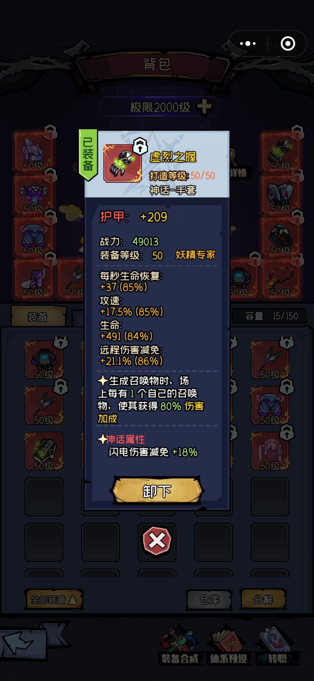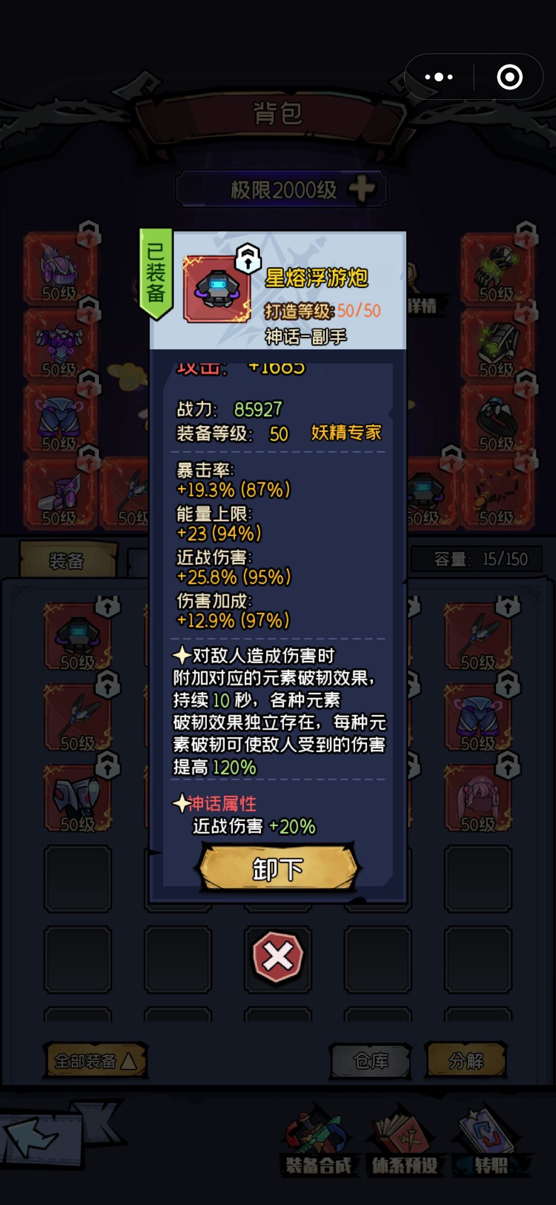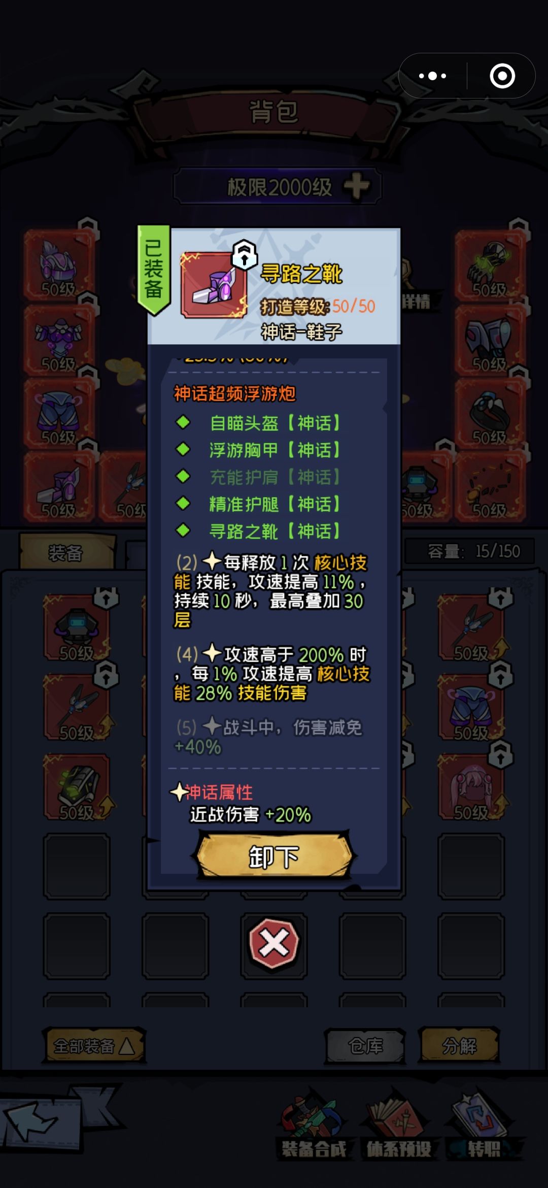 装备:套装和武器副手还有戒指神话属性选择近战,项链选择攻速,剩下的护手和护肩神话属性最好是全元素减免,不过最重要的是上面的基础属性要好。