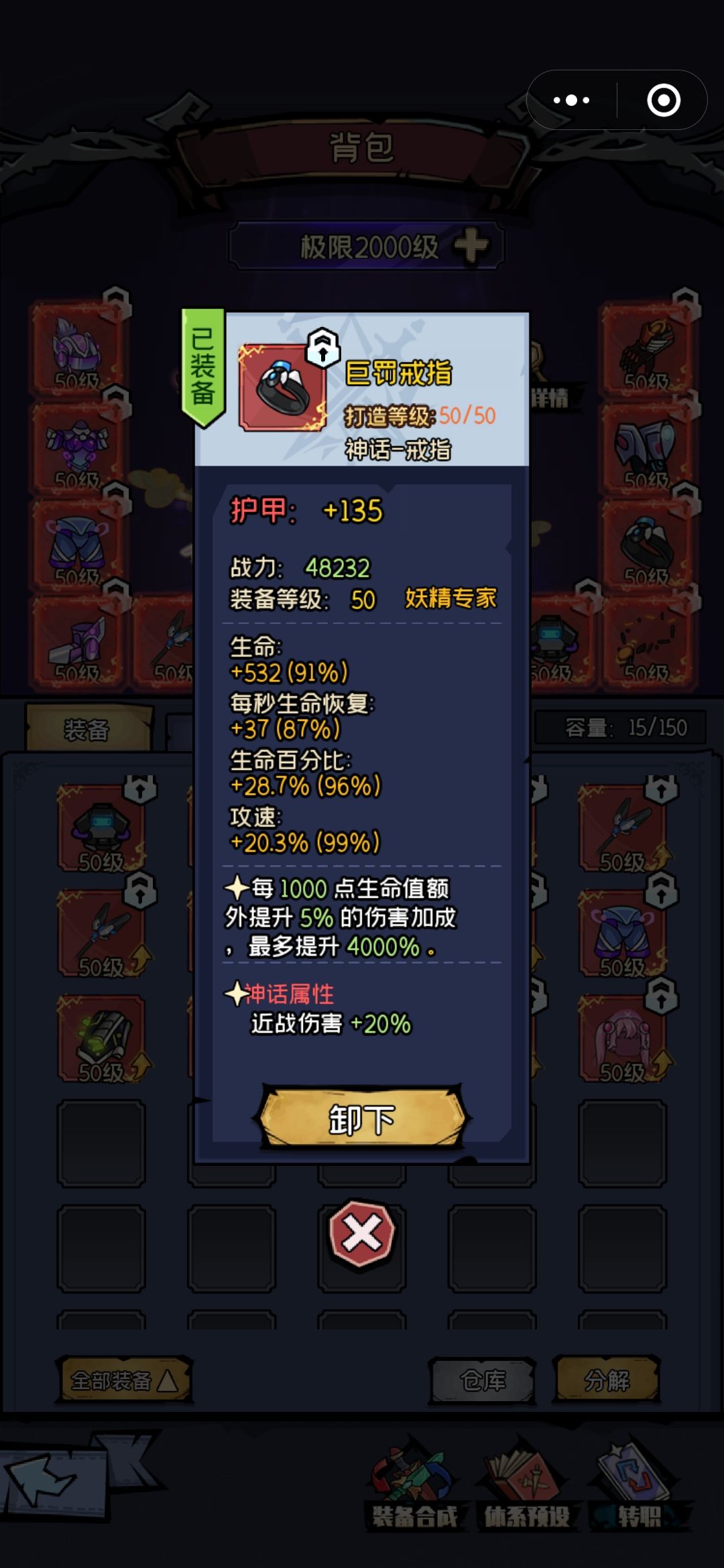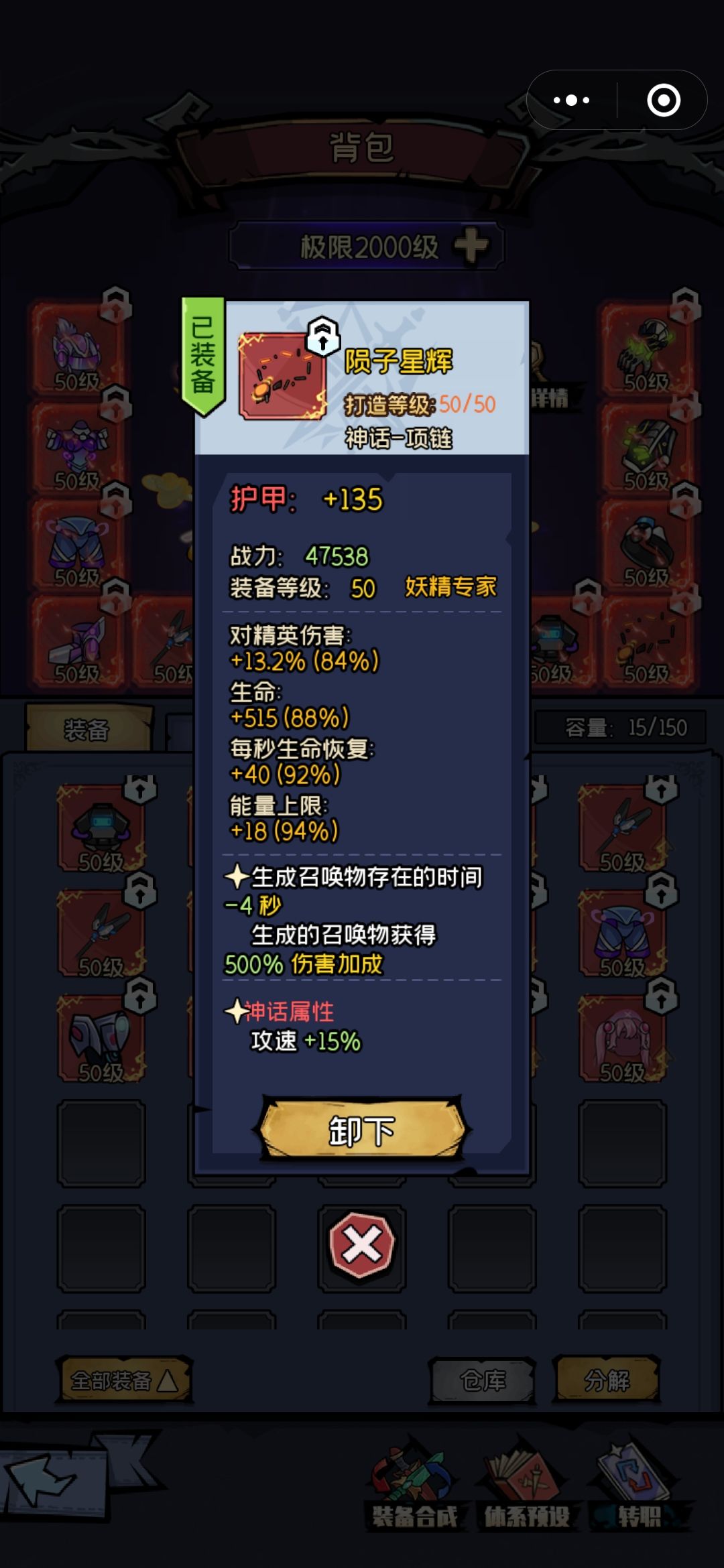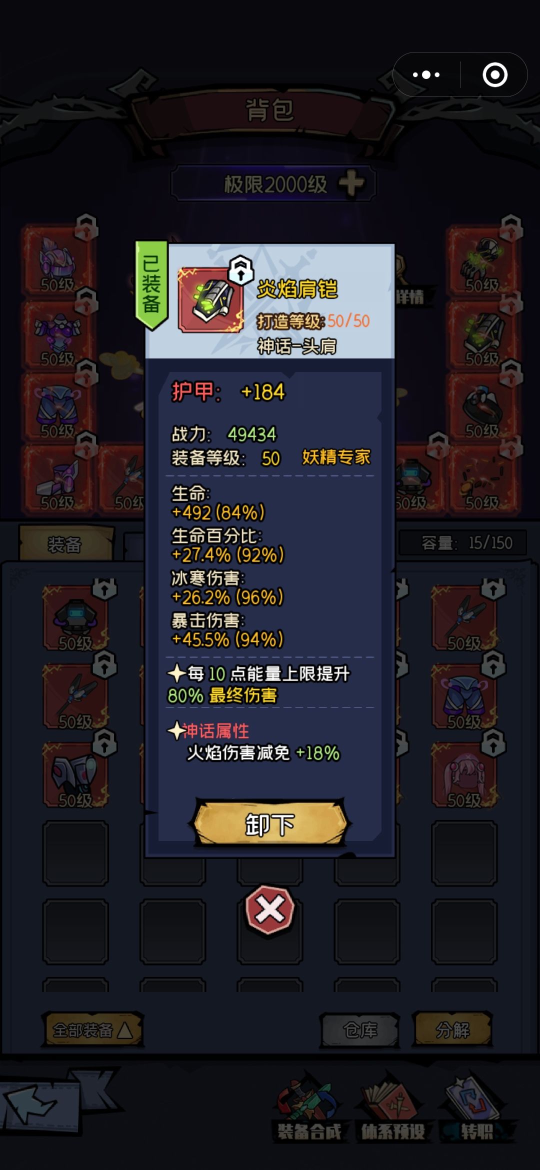装备:套装和武器副手还有戒指神话属性选择近战,项链选择攻速,剩下的护手和护肩神话属性最好是全元素减免,不过最重要的是上面的基础属性要好。