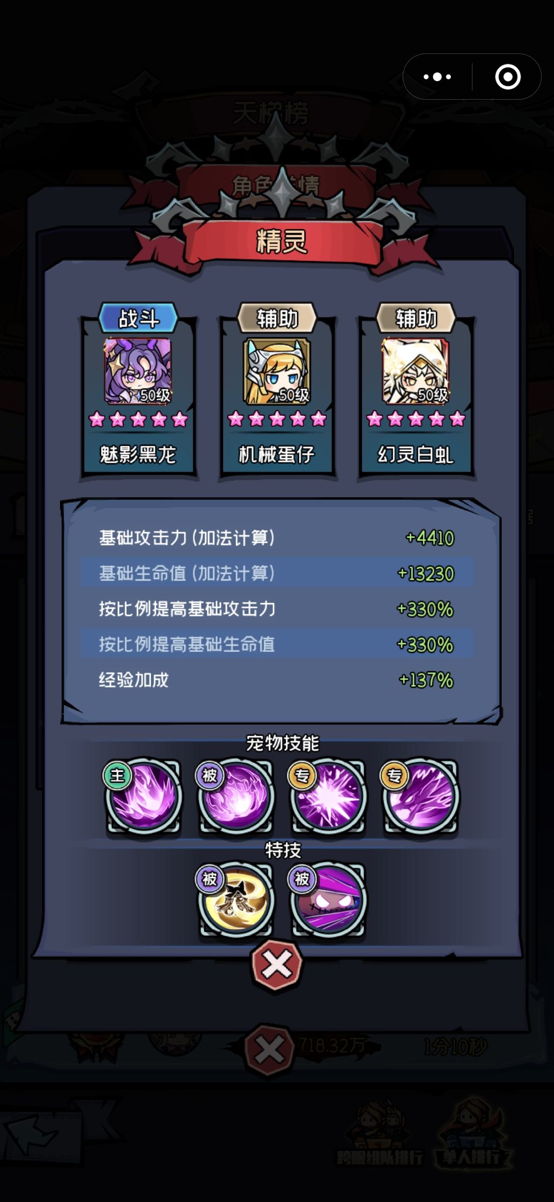 宠物还是黑龙为主,被动技能选择白蛇和小熊的,如图