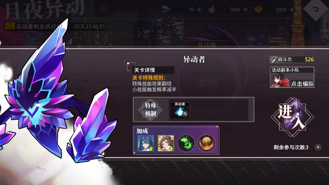 每日05:00恢复挑战次数,队长注意挑战时间。每天仅可免费挑战异动者3次,进入挑战队长记得查看编队情况。