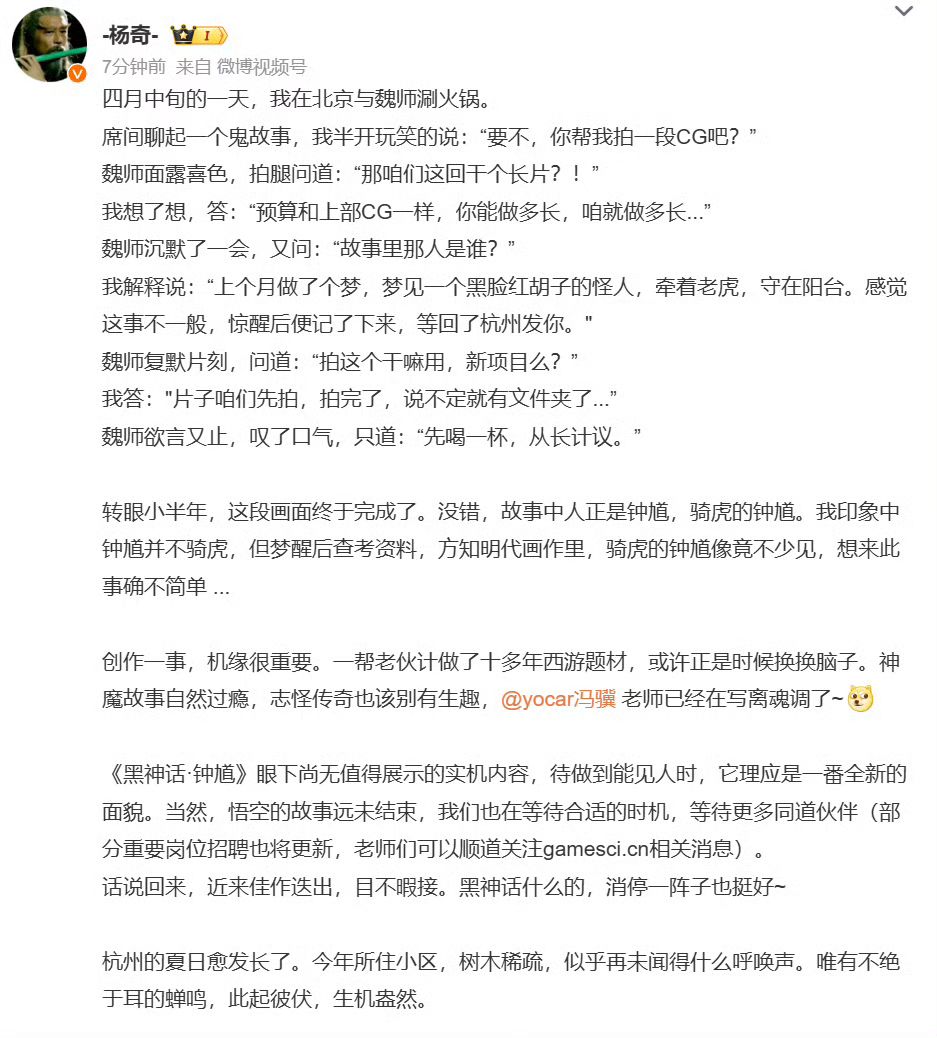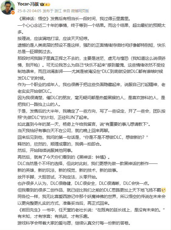 游戏科学《黑神话》IP新作《黑神话钟馗》公布后,主创冯骥和杨奇发长文谈新作开发契机。团队对《黑神话悟空》DLC曾经有过计划,但最终选择先开发《黑神话》IP新作。