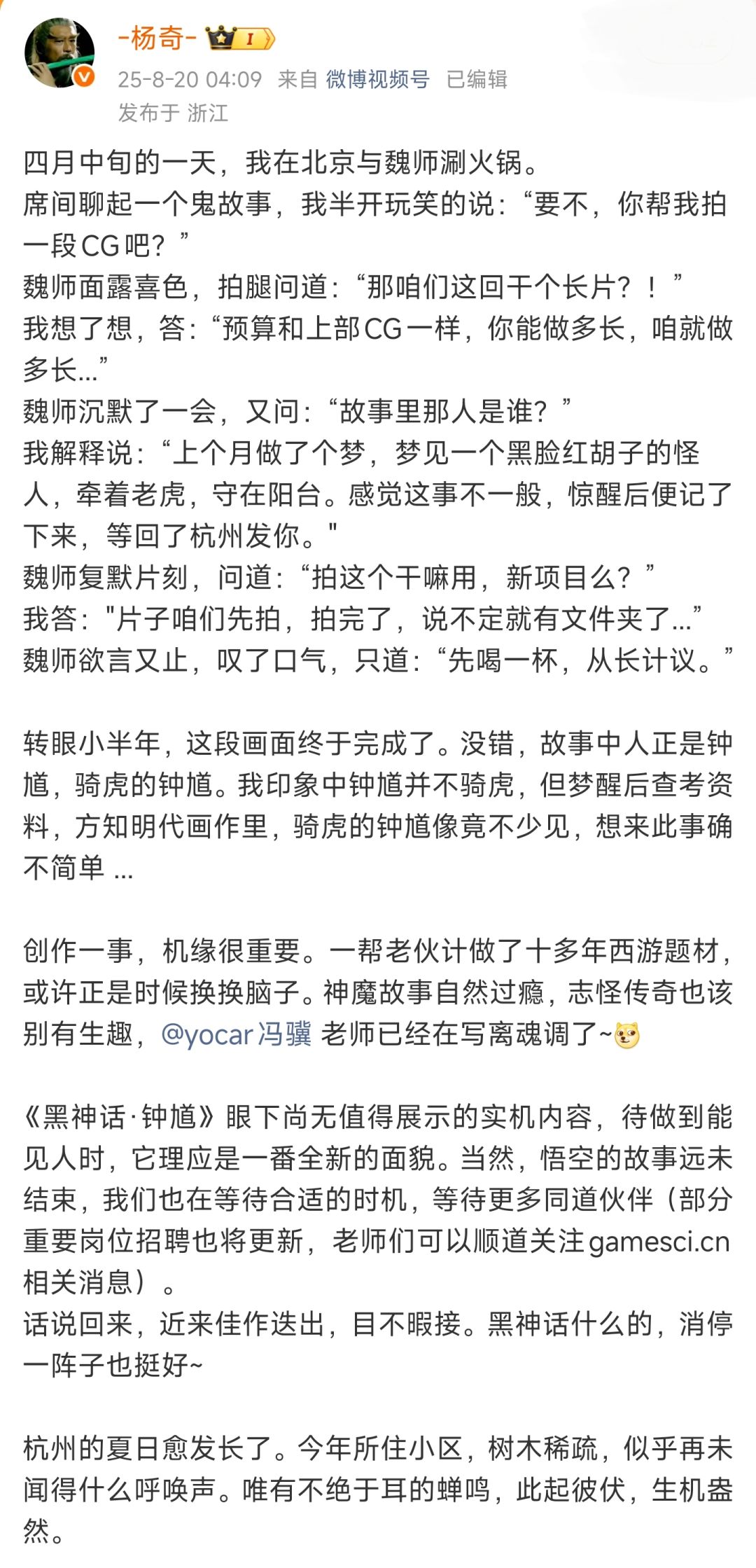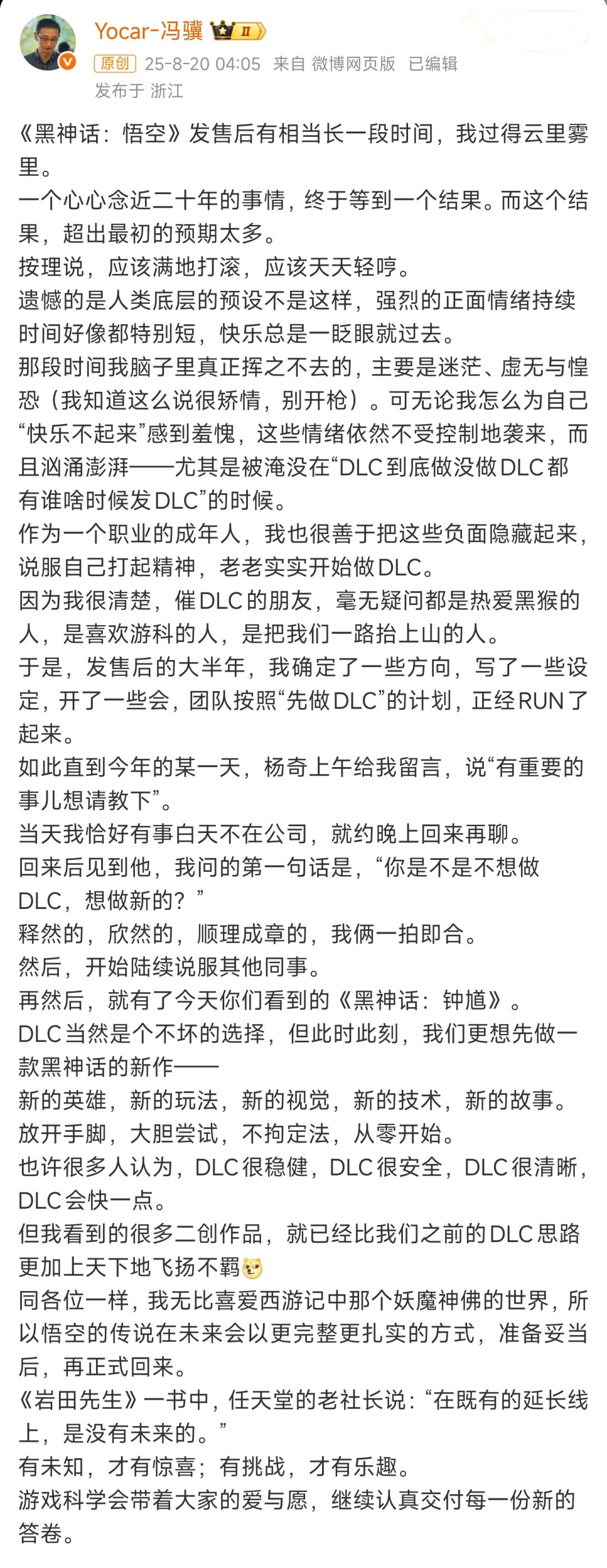冯骥发文:比起黑神话悟空DLC,更想做新故事。