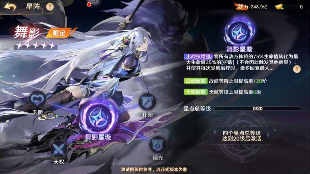 本次更新后,战灵星阵养成新增舞影;星阵不仅可以提升战灵的技能强度、还将提升战魂、天赋等级上限。更多详细内容以游戏内为准。