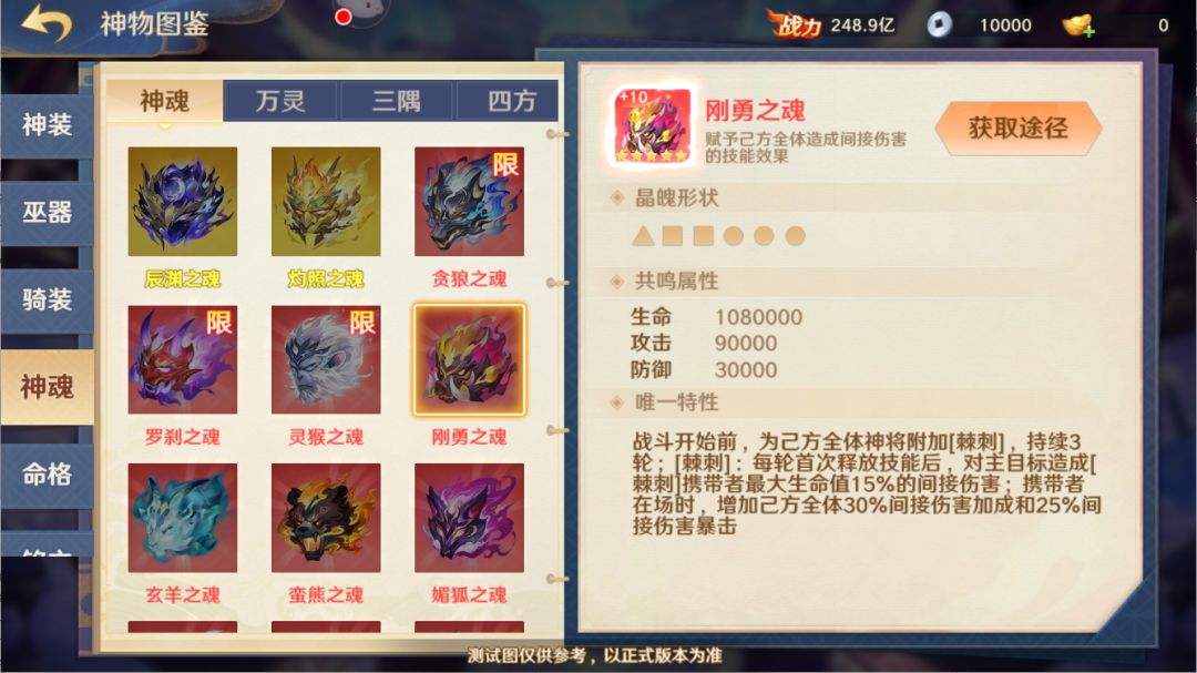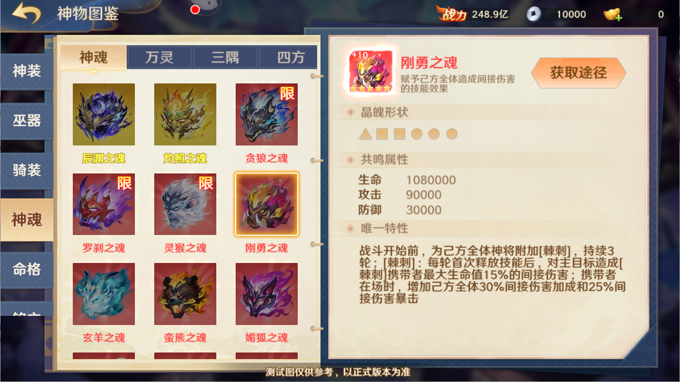 新增红色神魂“刚勇之魂”,详细如下: 满星刚勇之魂:战斗开始前,为己方全体神将附加[棘刺],持续3轮;[棘刺]:每轮首次释放技能后,对主目标造成[棘刺]携带者最大生命值一定百分比的间接伤害;携带者在场时,增加己方全体一定百分比间接伤害加成和间接伤害暴击。