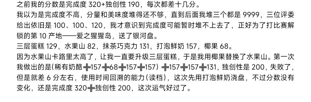 第3产地10级制作,第10产地比赛,这次卡路里没有超标,不用兰栗田(卡路里减少),用了李耕夫(口感提升)。最终520分拿下比赛。